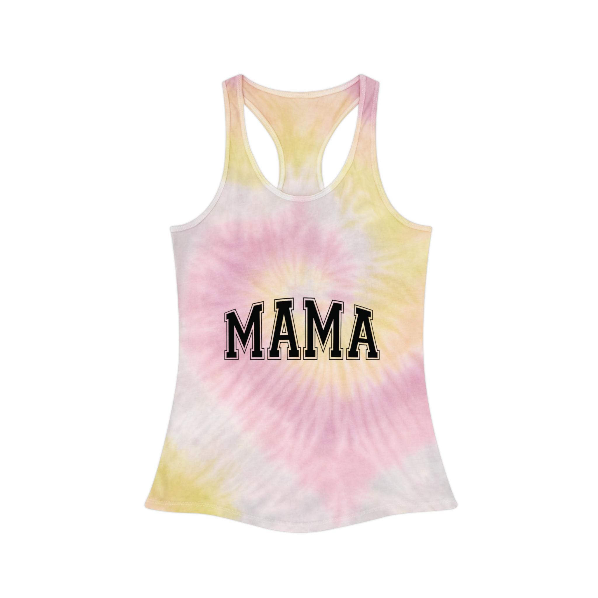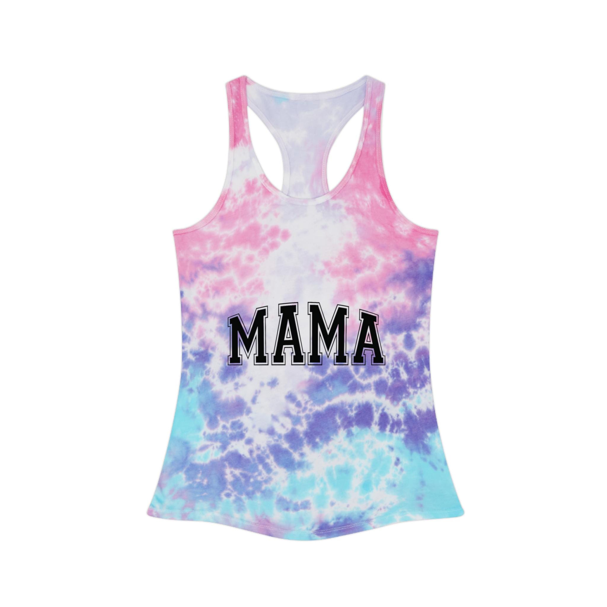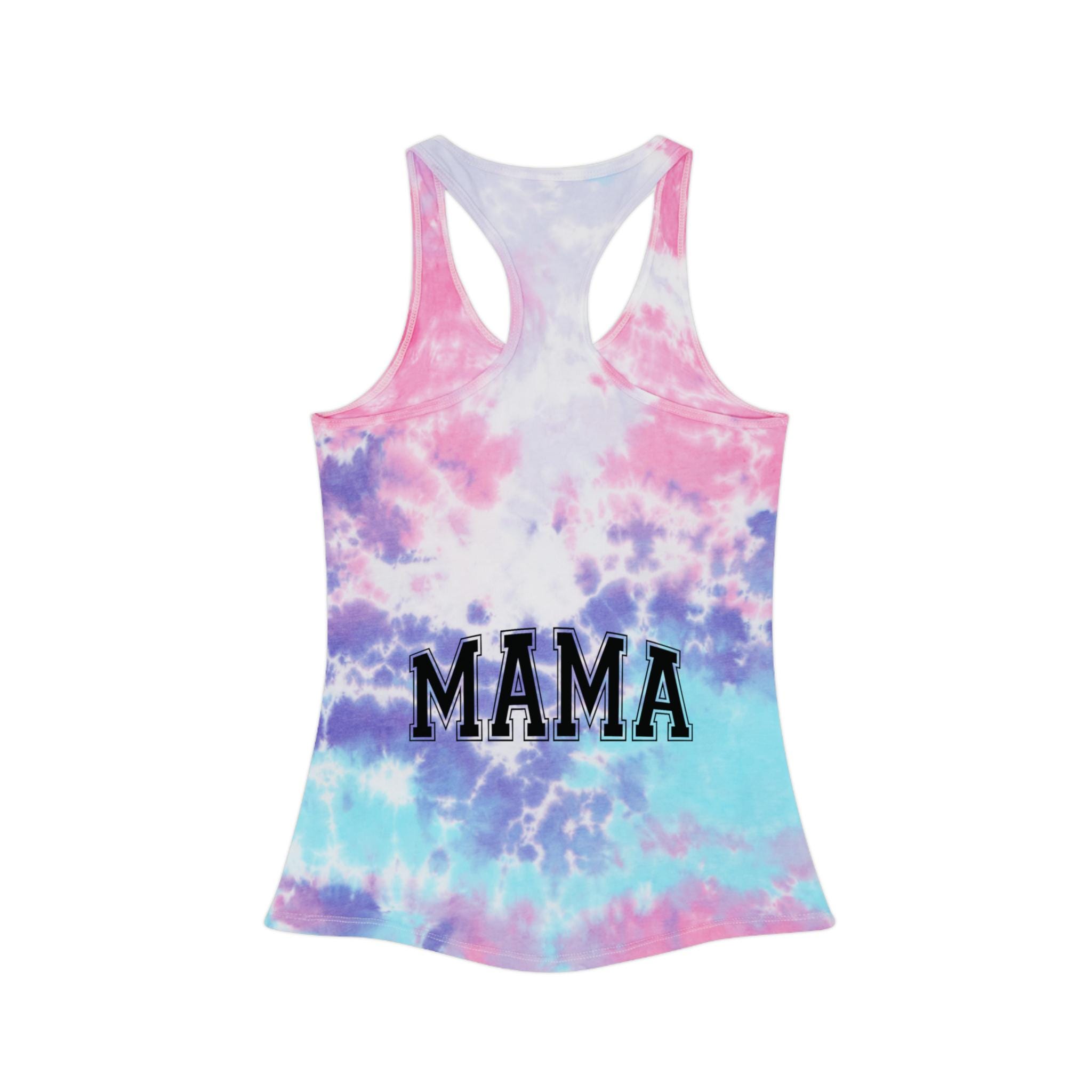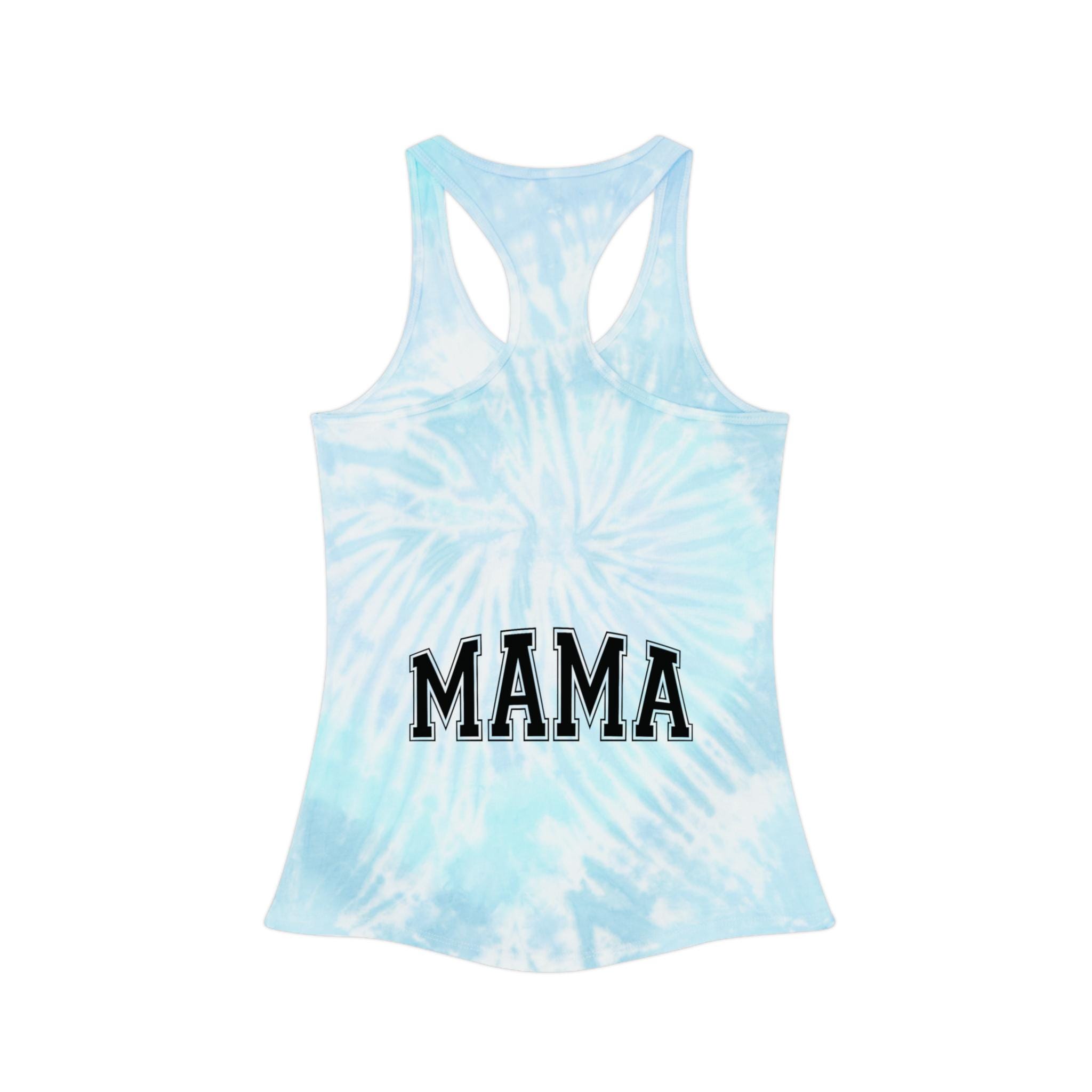 This racerback tank brings a sun-drenched, handmade energy to warm-weather days. The faded tie-dye wash and bold black varsity “Mama” on both front and back feels like a worn-in favorite from the moment you put it on. Lightweight and slim through the body, it layers easily under a denim jacket for park mornings or stands alone for backyard barbecues and school pickup runs. The curved hem and neat self-fabric binding give a clean, slightly elevated silhouette while subtle variations in the dye make each top uniquely yours. It’s for moms who move through their day with rhythm — chasing little feet, sipping coffee in the car, and laughing loud enough to fill the room.