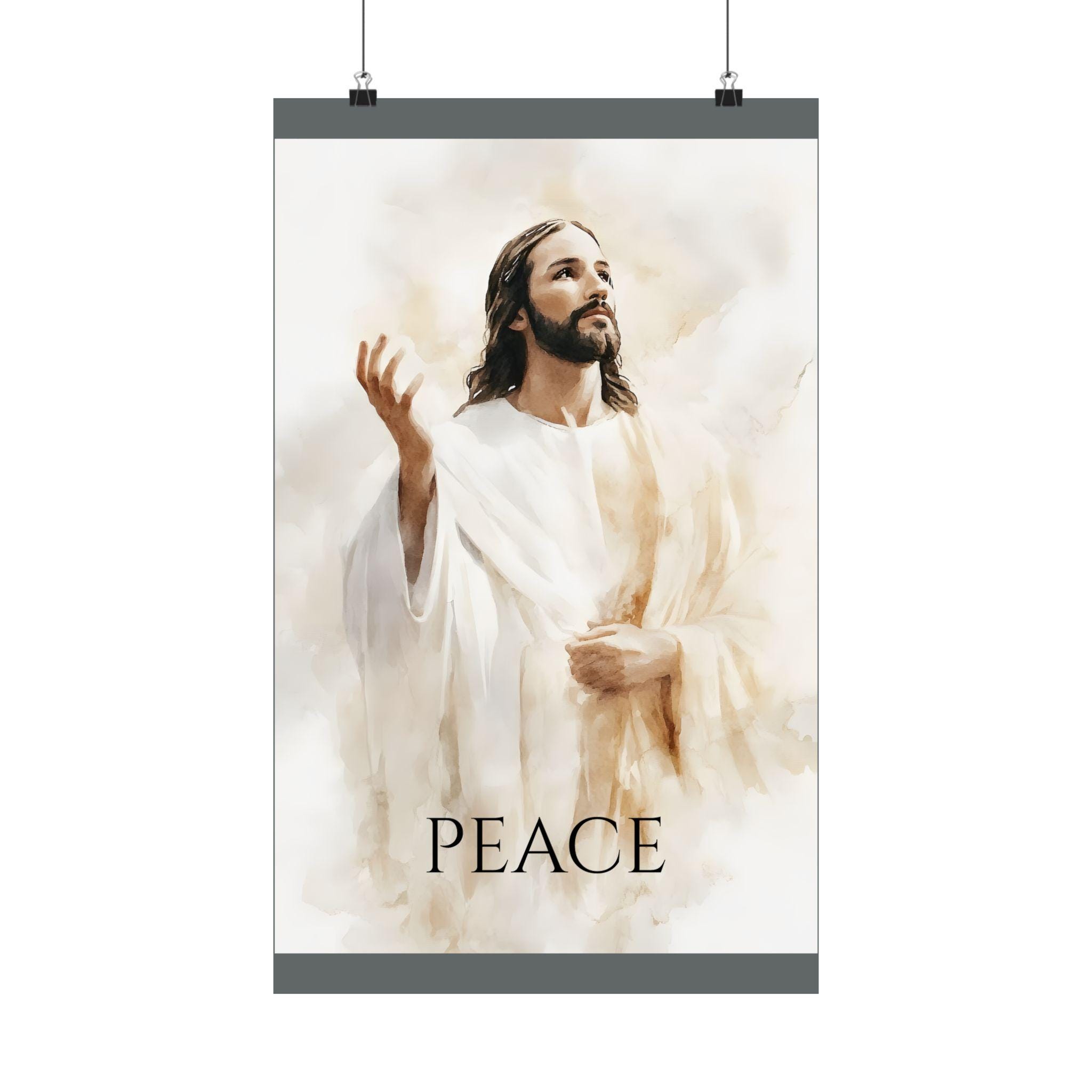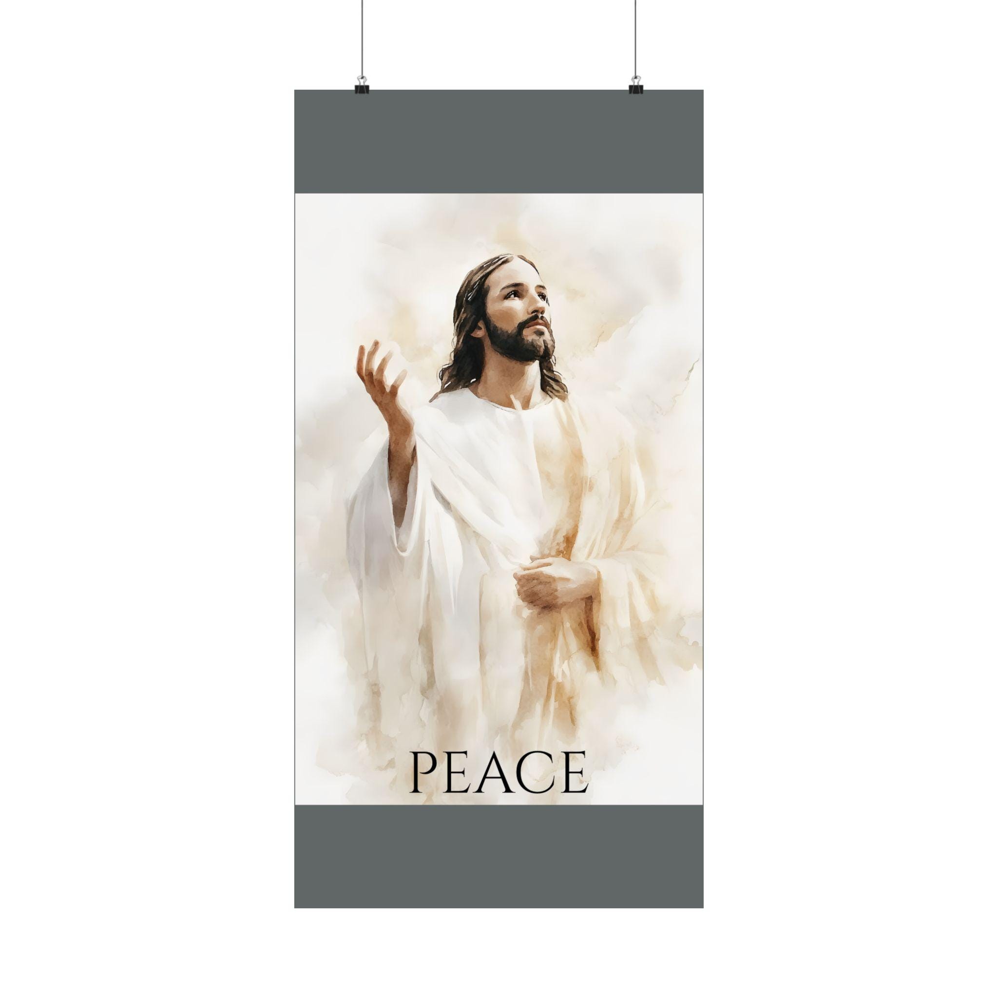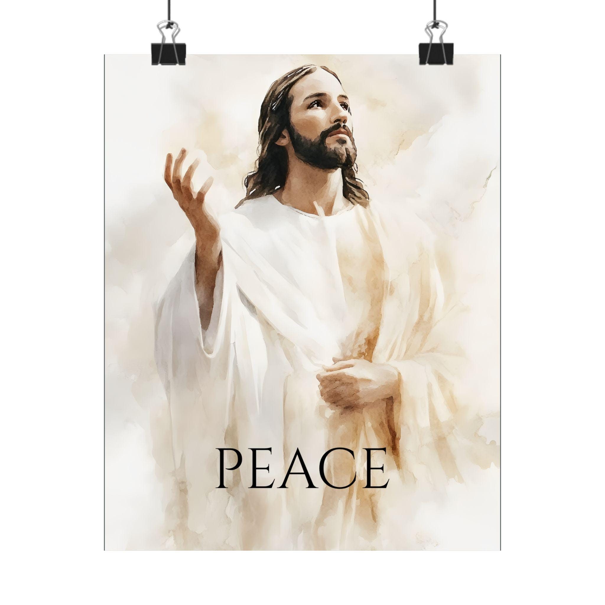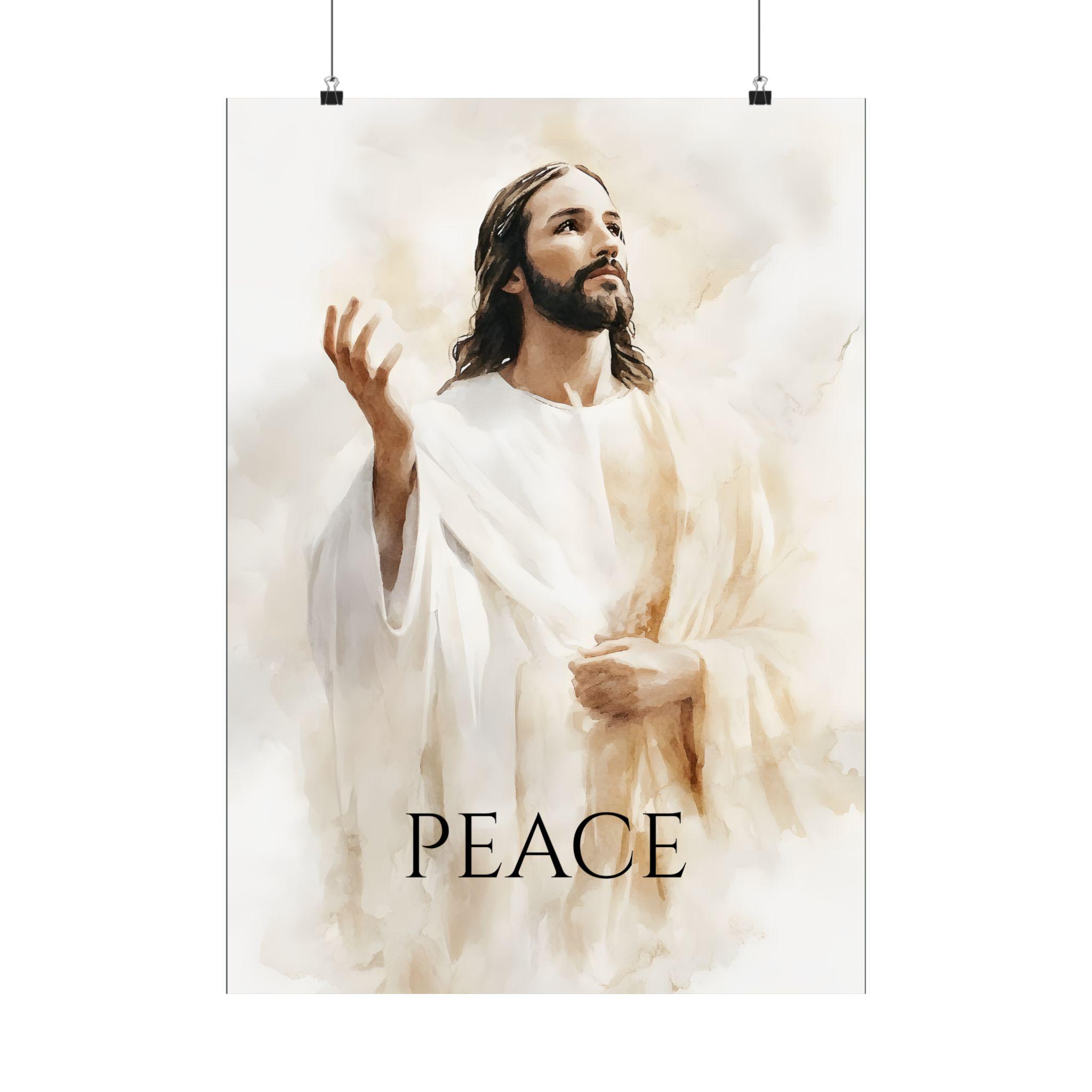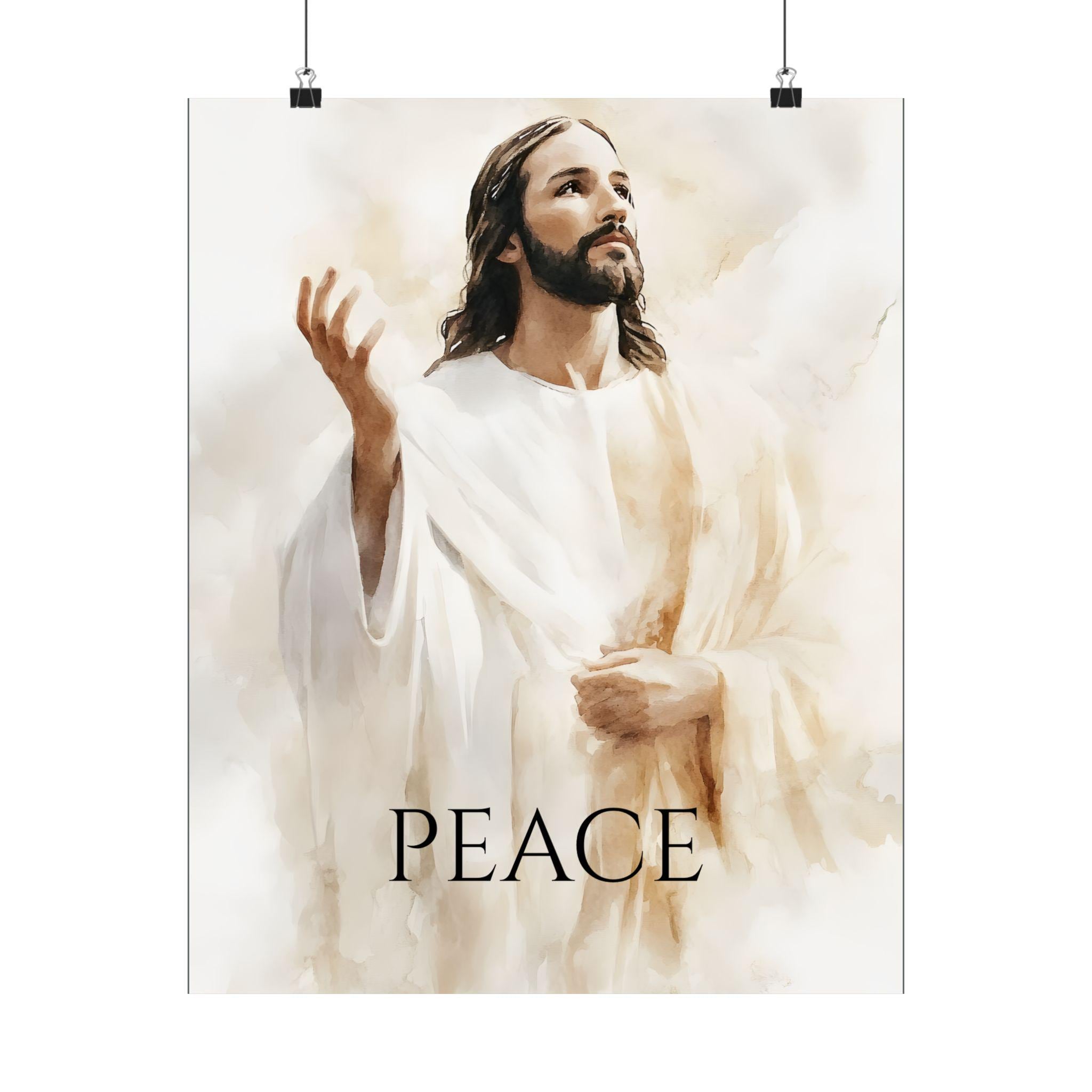 This Poster features a large portrait of Jesus the Son of God giving peace to mankind, creating a serene and spiritual atmosphere in any room. Perfect for those seeking religious decor or looking to add a calming touch to their space. Ideal for Christian holidays and celebrations.