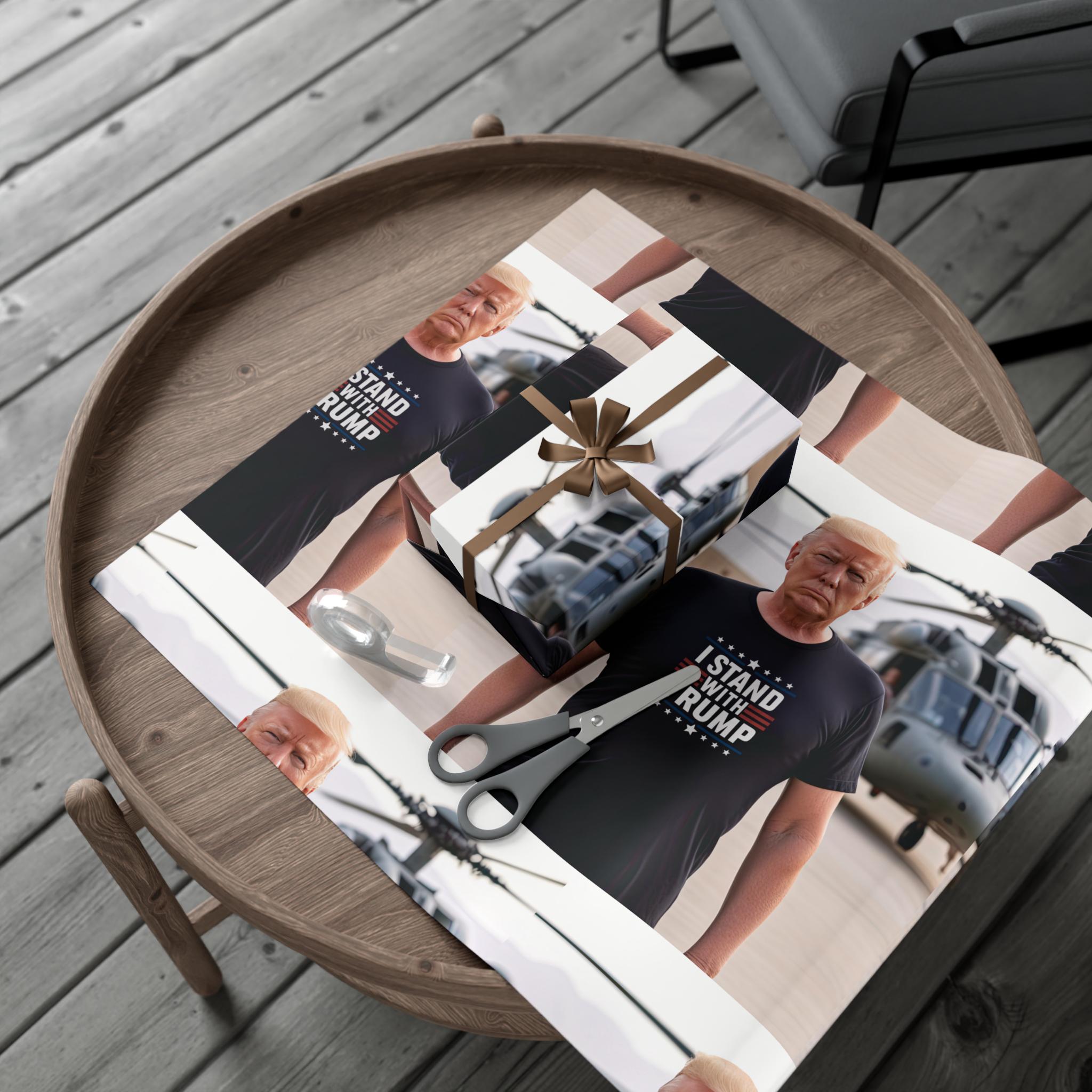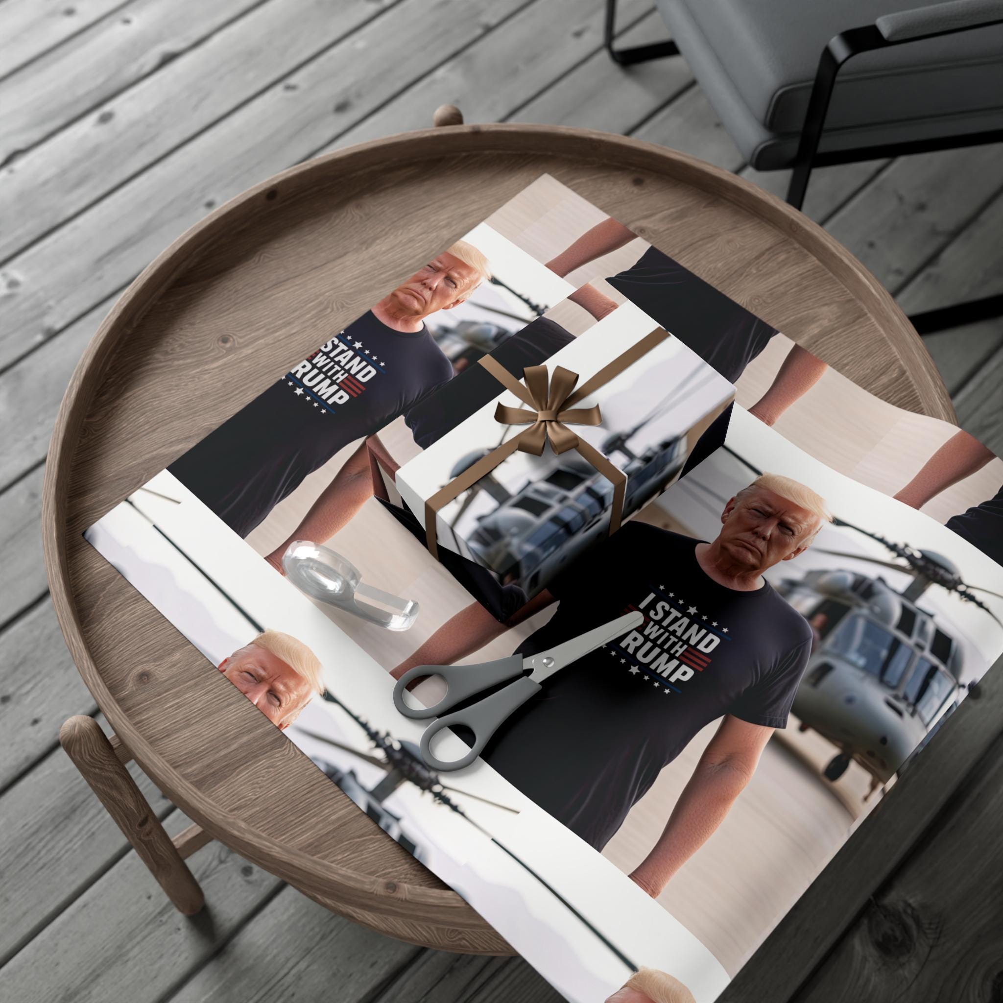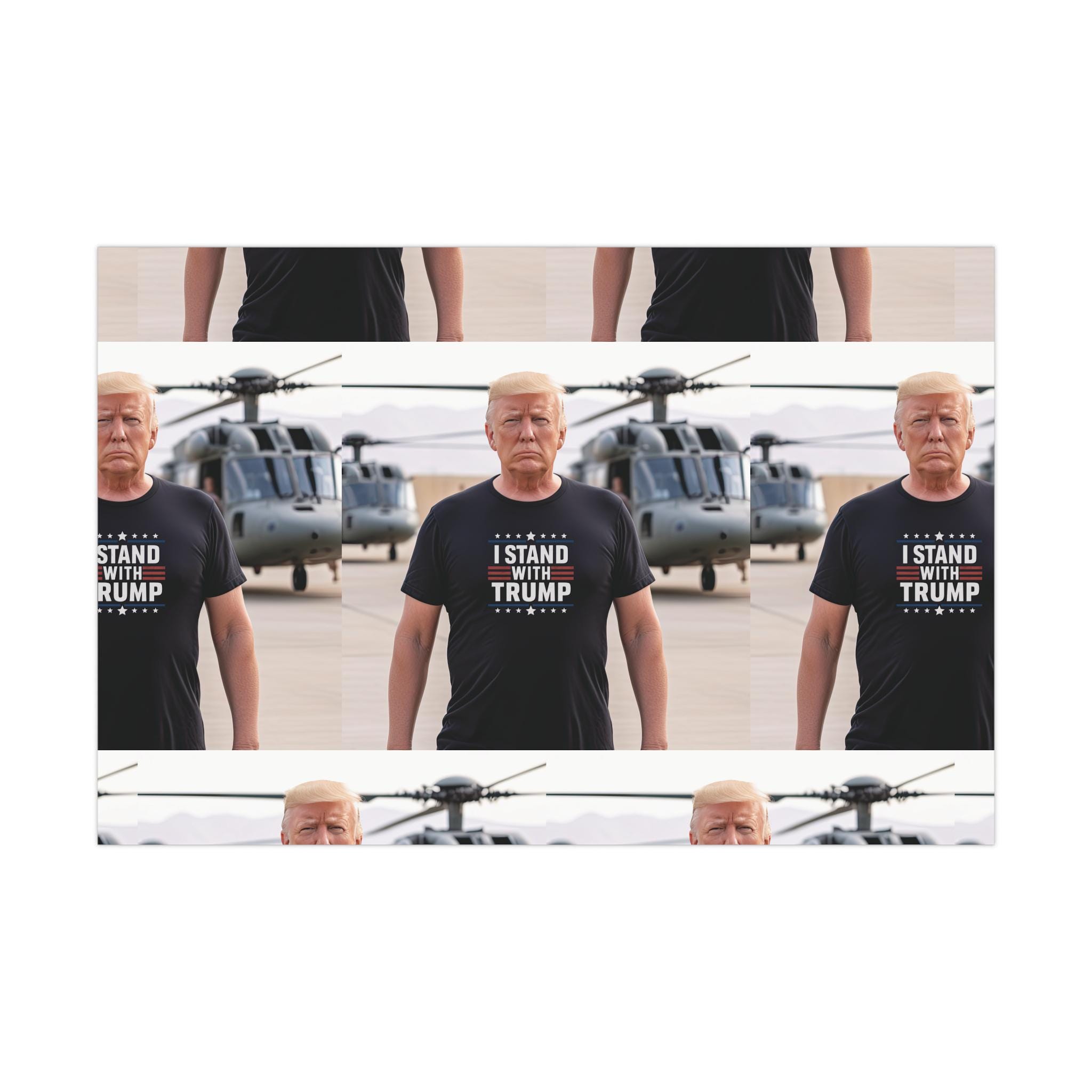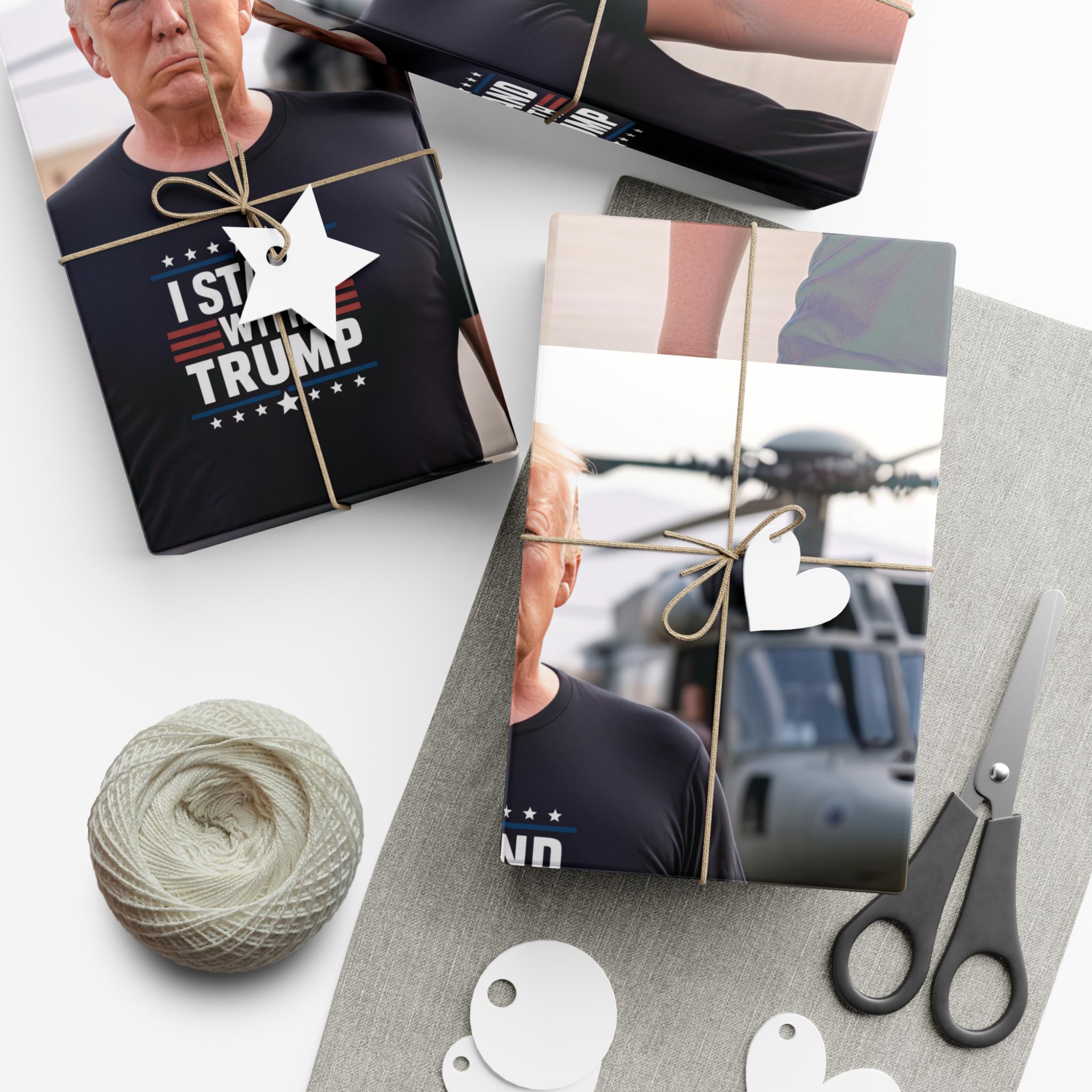 Vibrant gift wrap sheets featuring a graphic of Donald Trump wearing a tshirt that reads, "I Stand with Trump" while standing on an American military base. Perfect for Trump supporters and Maga enthusiasts. Ideal for wrapping gifts during political events, birthdays, or holidays.
