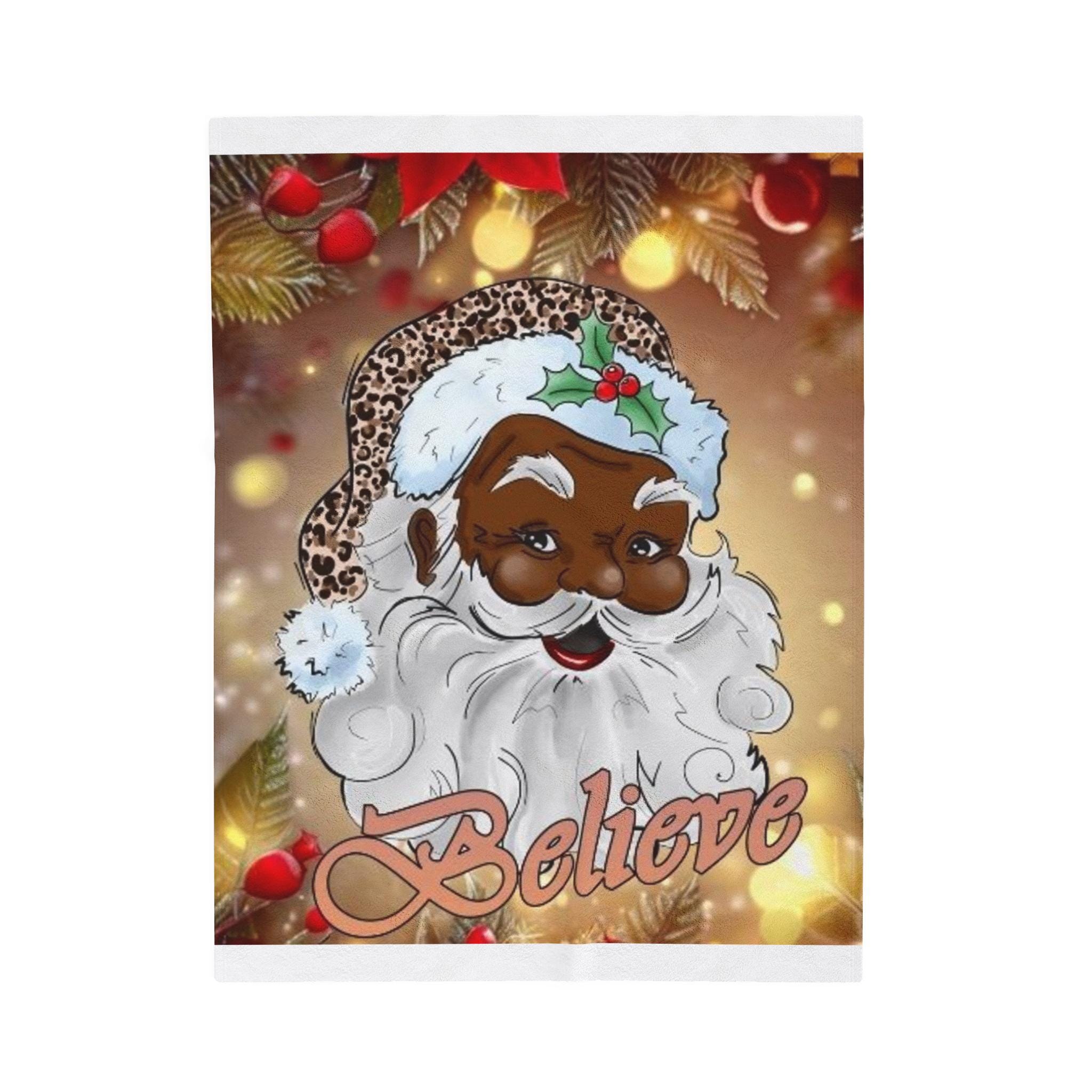 This Velveteen Plush Blanket features a festive design of Holly Jolly Black Santa, a.k.a. Blanta Clause. The blanket exudes a cozy holiday vibe, perfect for snuggling up during Christmas celebrations. Ideal for those looking to add a touch of diversity to their holiday decor.