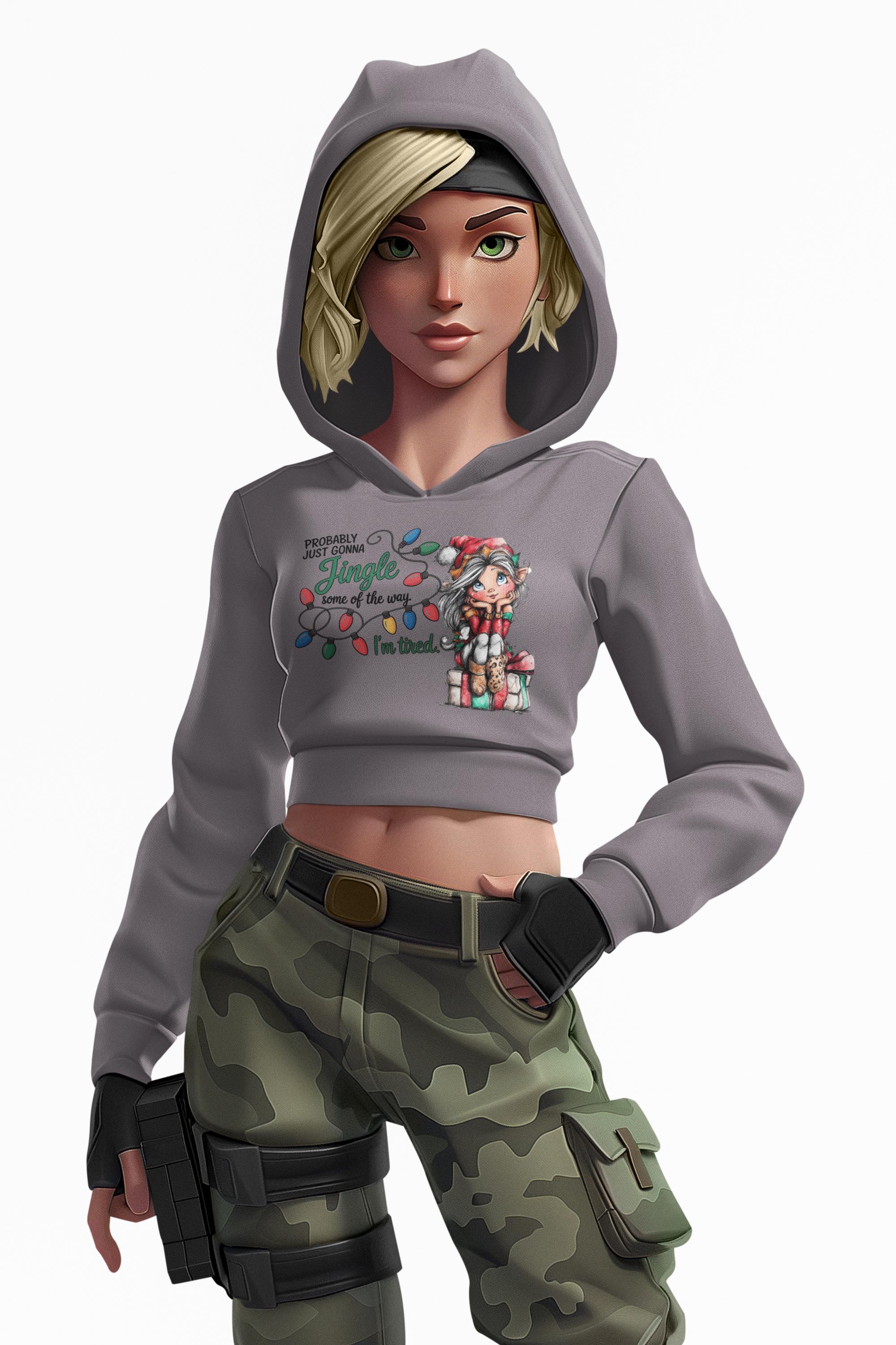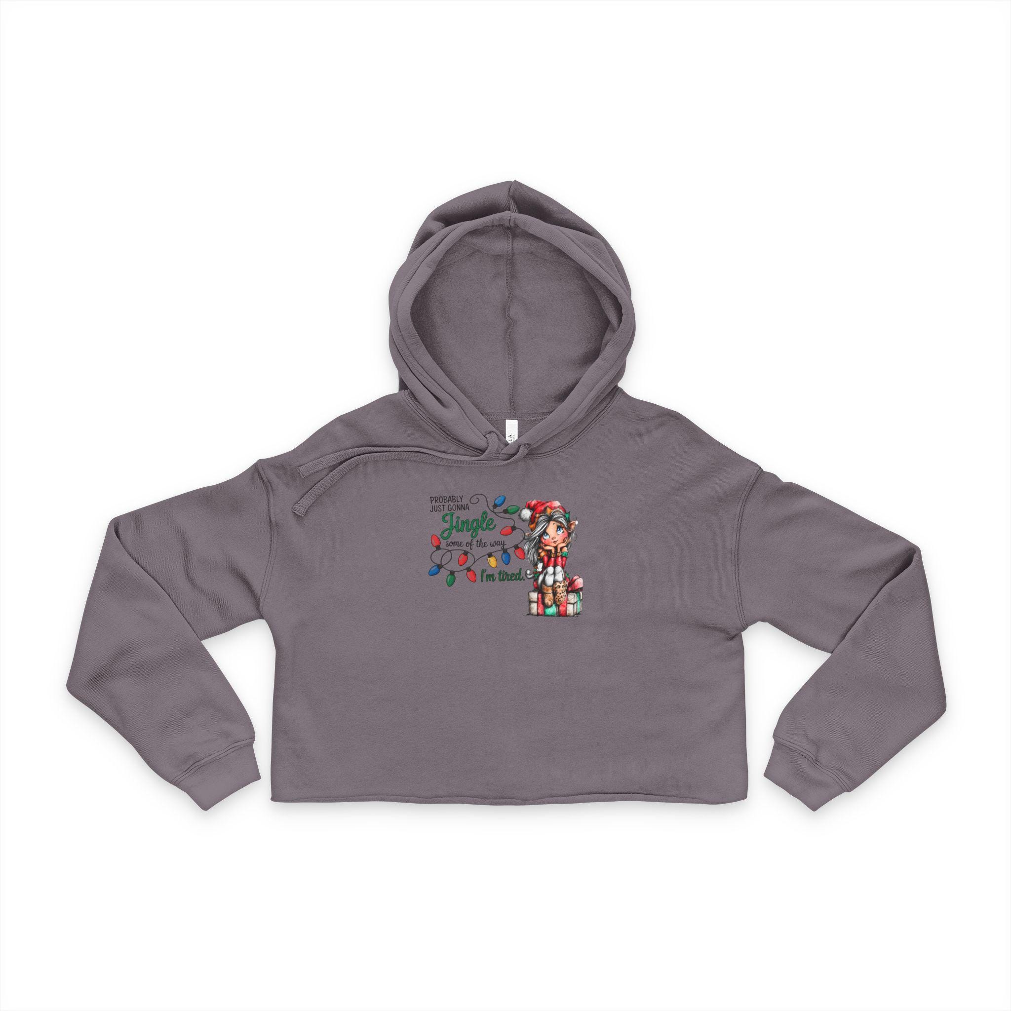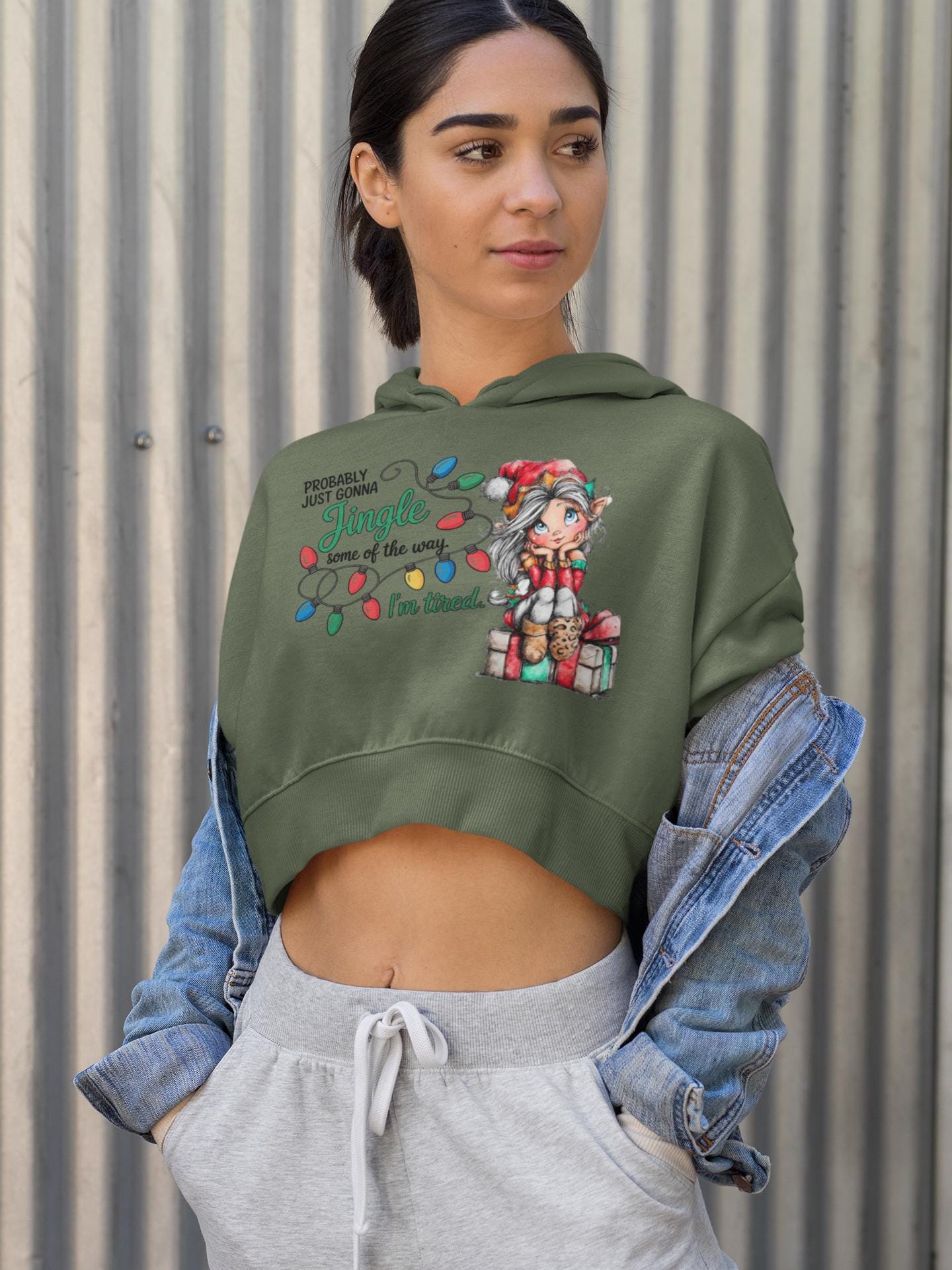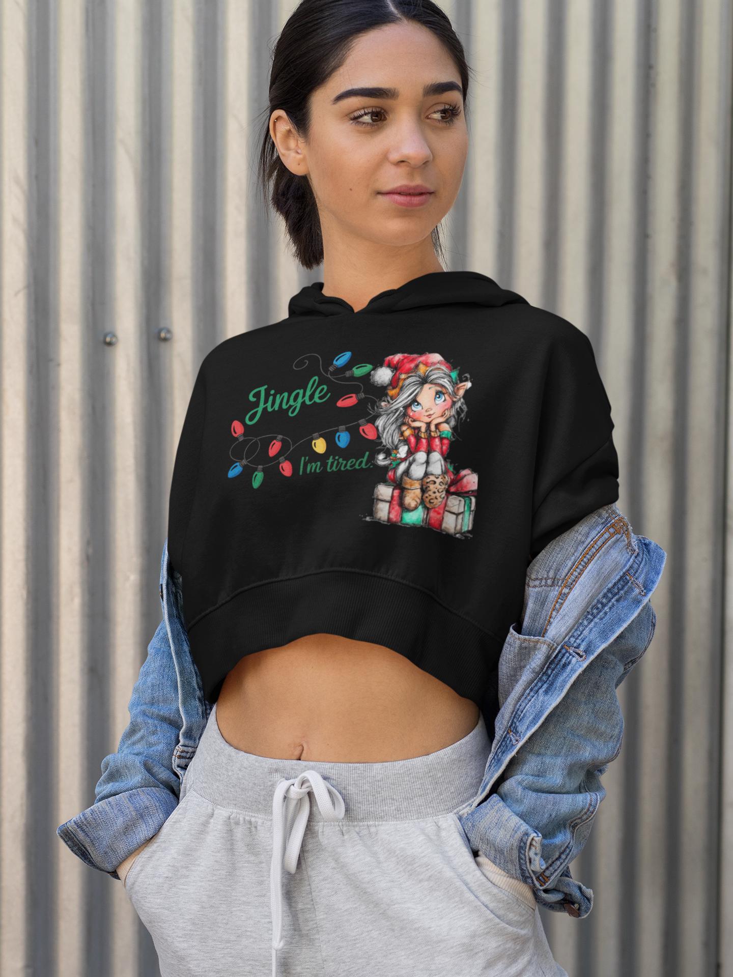 This Cropped Hoodie features an image of a pretty elf girl with the quote 'I think I'll jingle all the way, I'm tired'. Perfect for those who love a touch of whimsy in their style. This hoodie is great for the holiday season and those who enjoy expressing their unique personality through fashion.