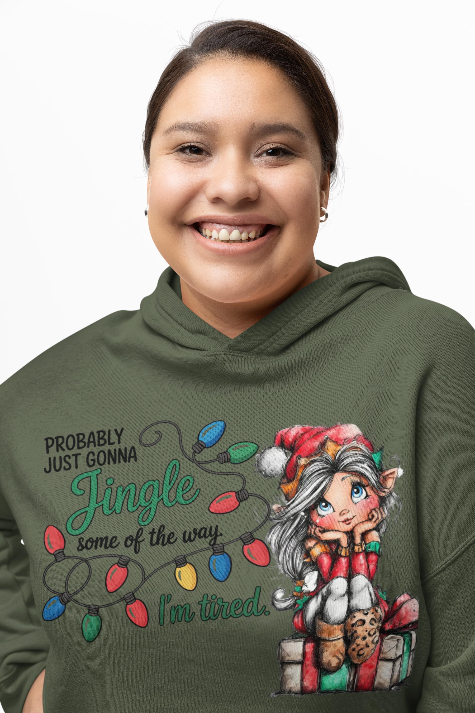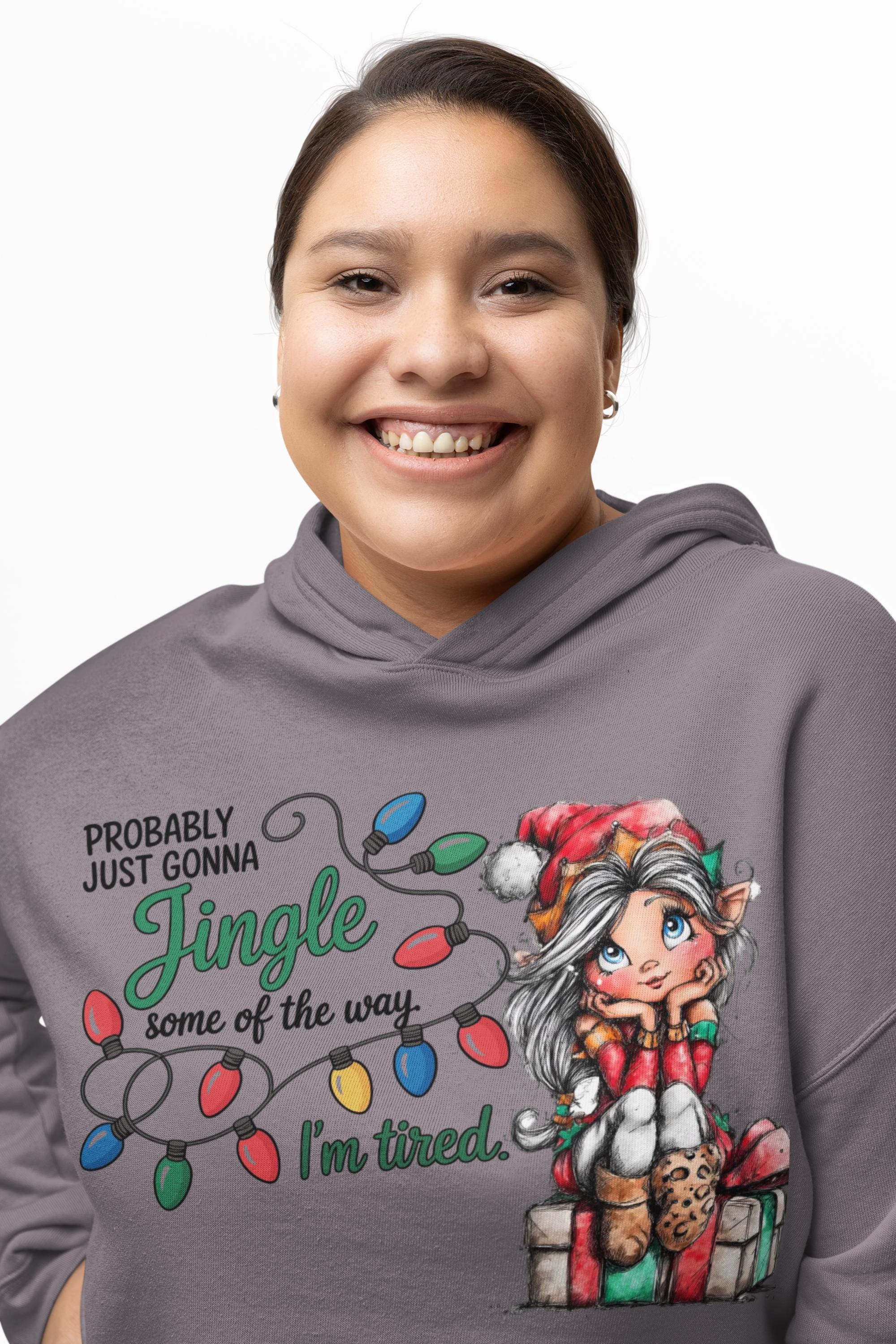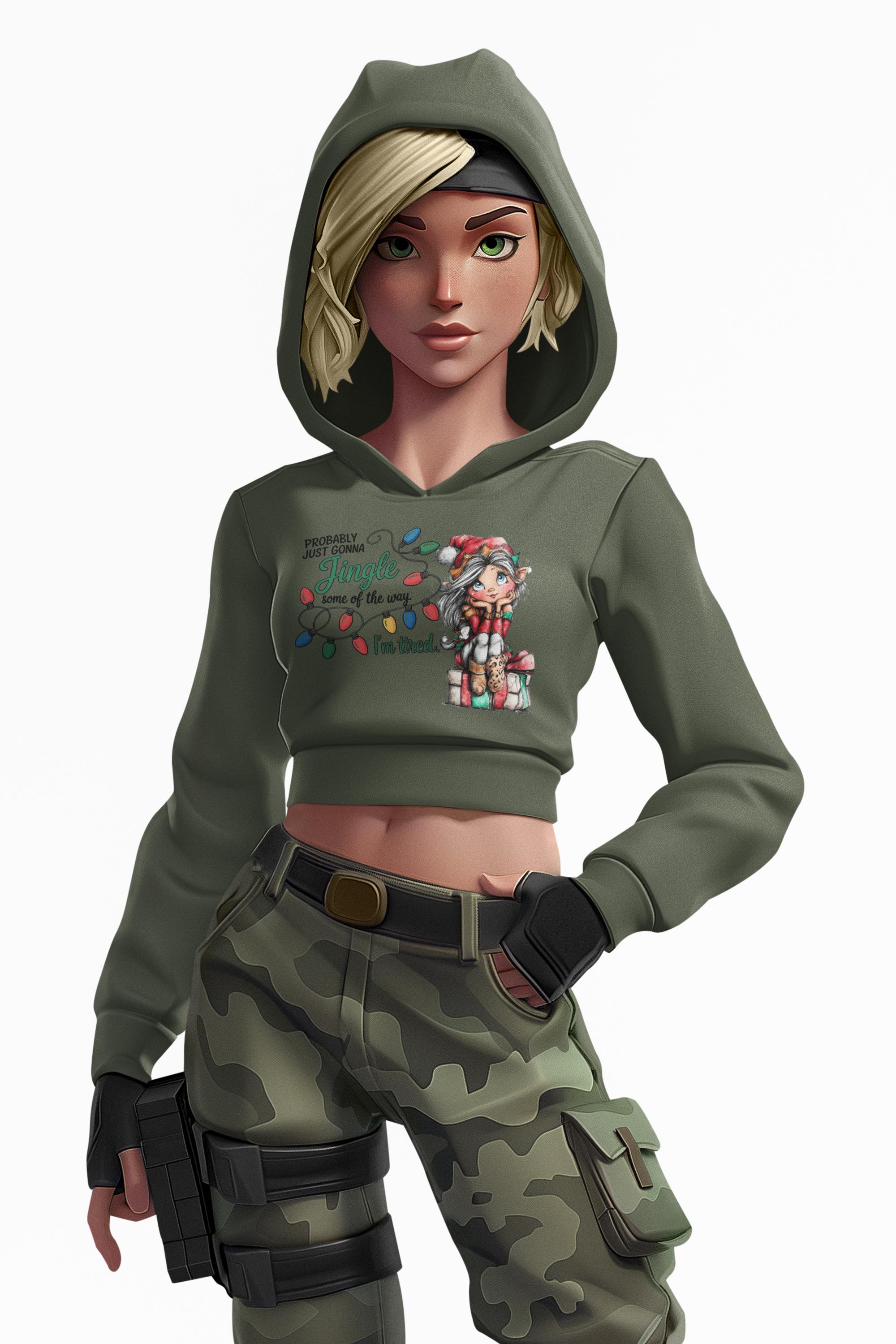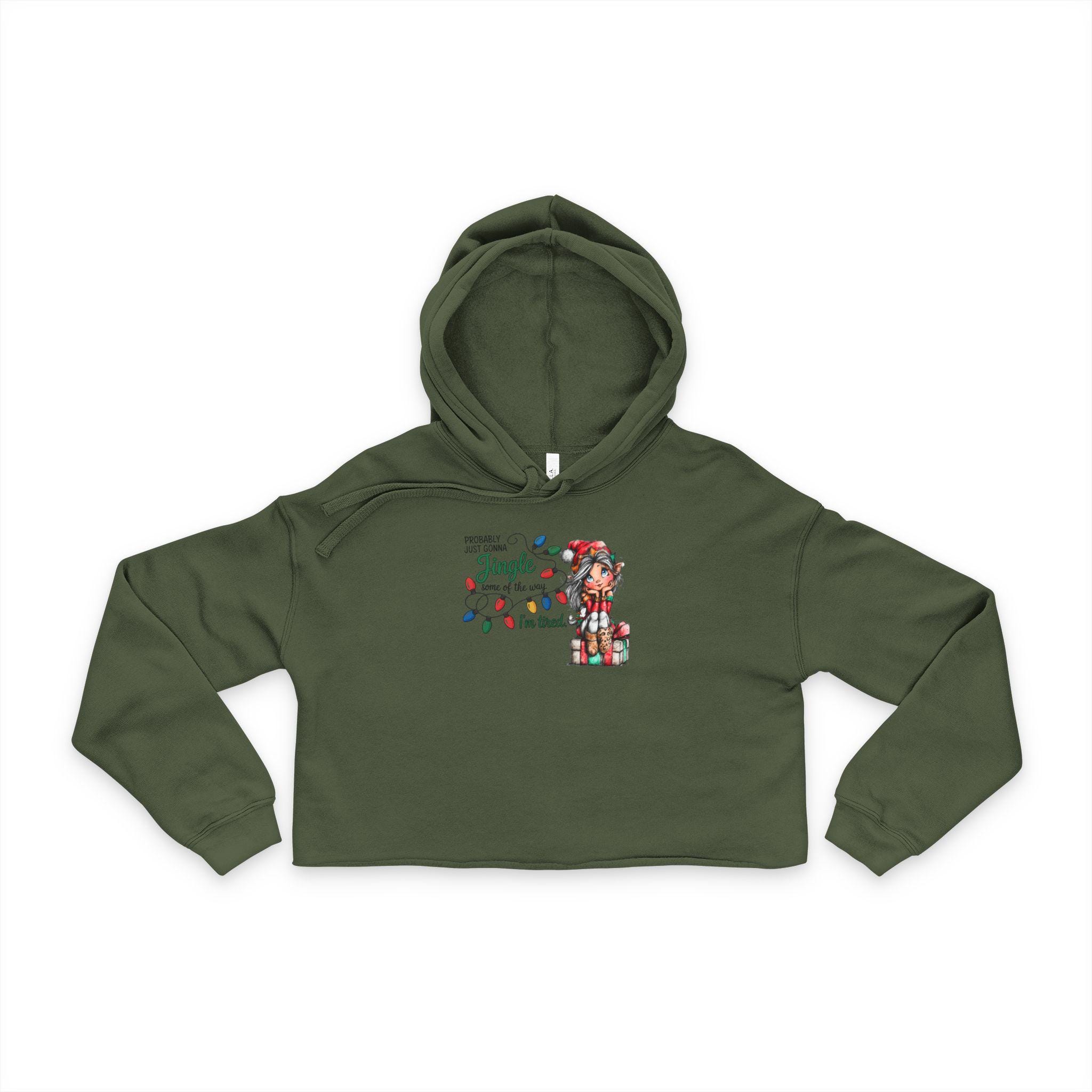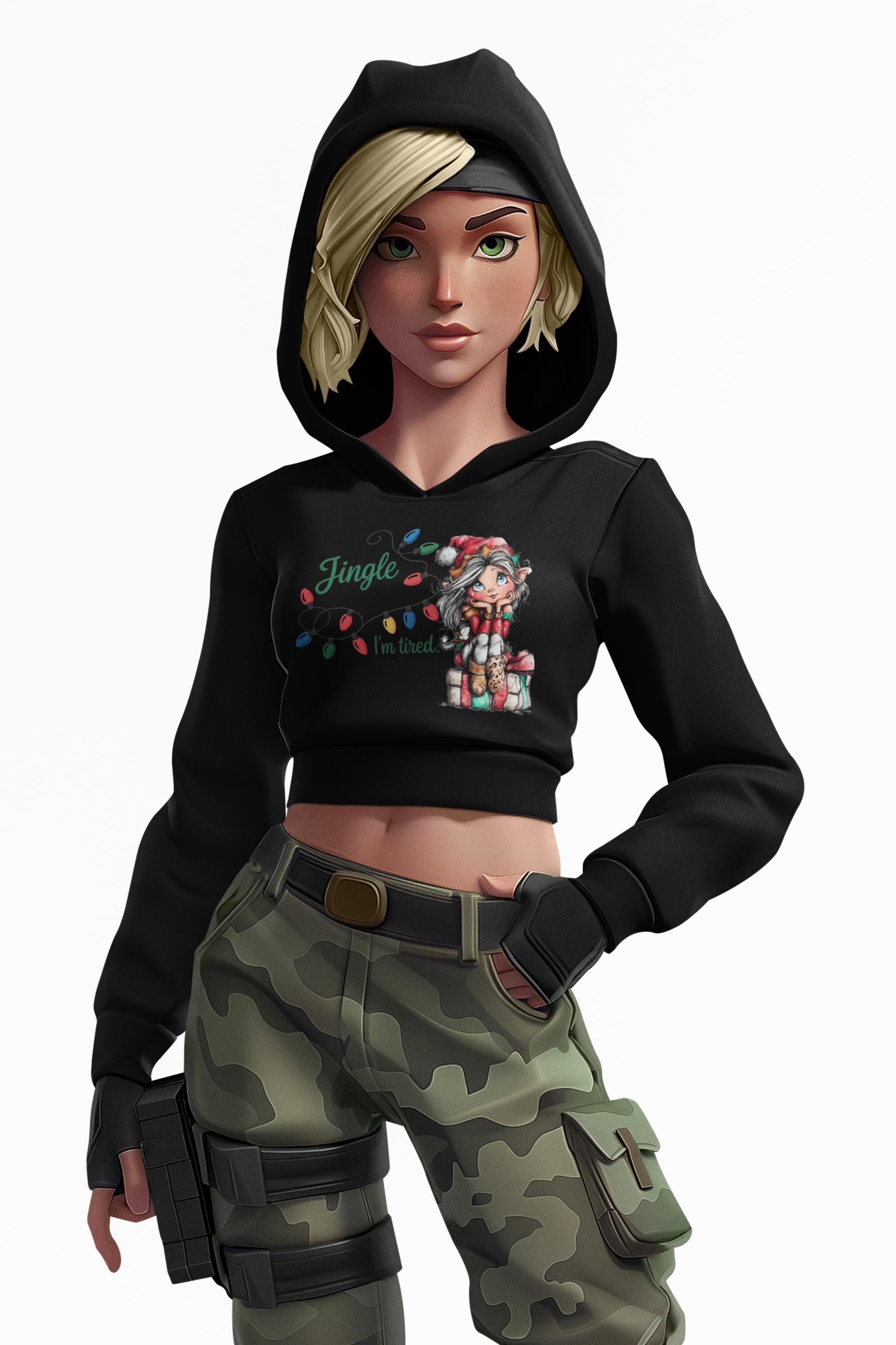 This Cropped Hoodie features an image of a pretty elf girl with the quote 'I think I'll jingle all the way, I'm tired'. Perfect for those who love a touch of whimsy in their style. This hoodie is great for the holiday season and those who enjoy expressing their unique personality through fashion.