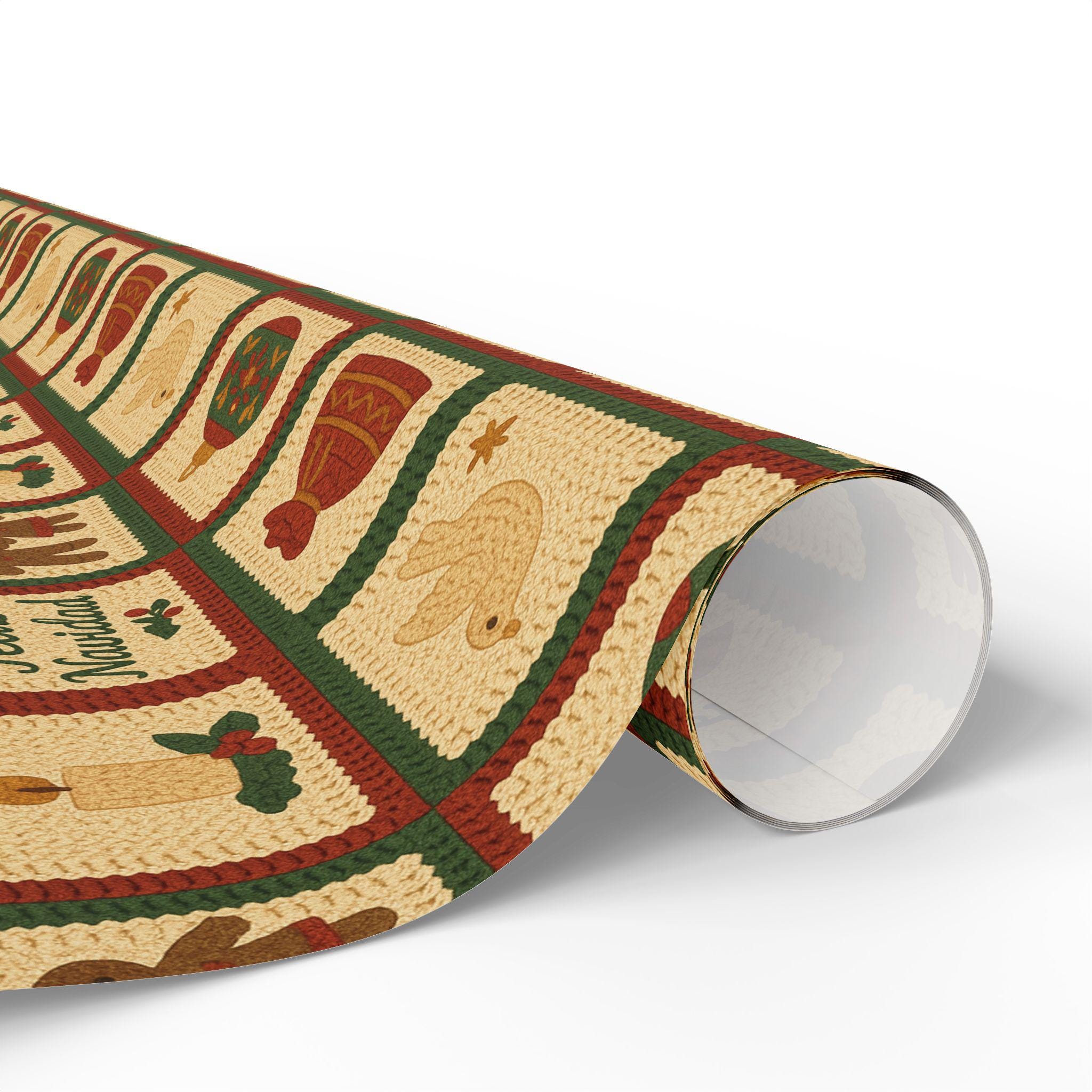 Holiday Wrapping Papers - Vintage Style Crochet Granny Squares with Hispanic Santa and Nativity Theme, Christmas Gift Wrap, Festive Present