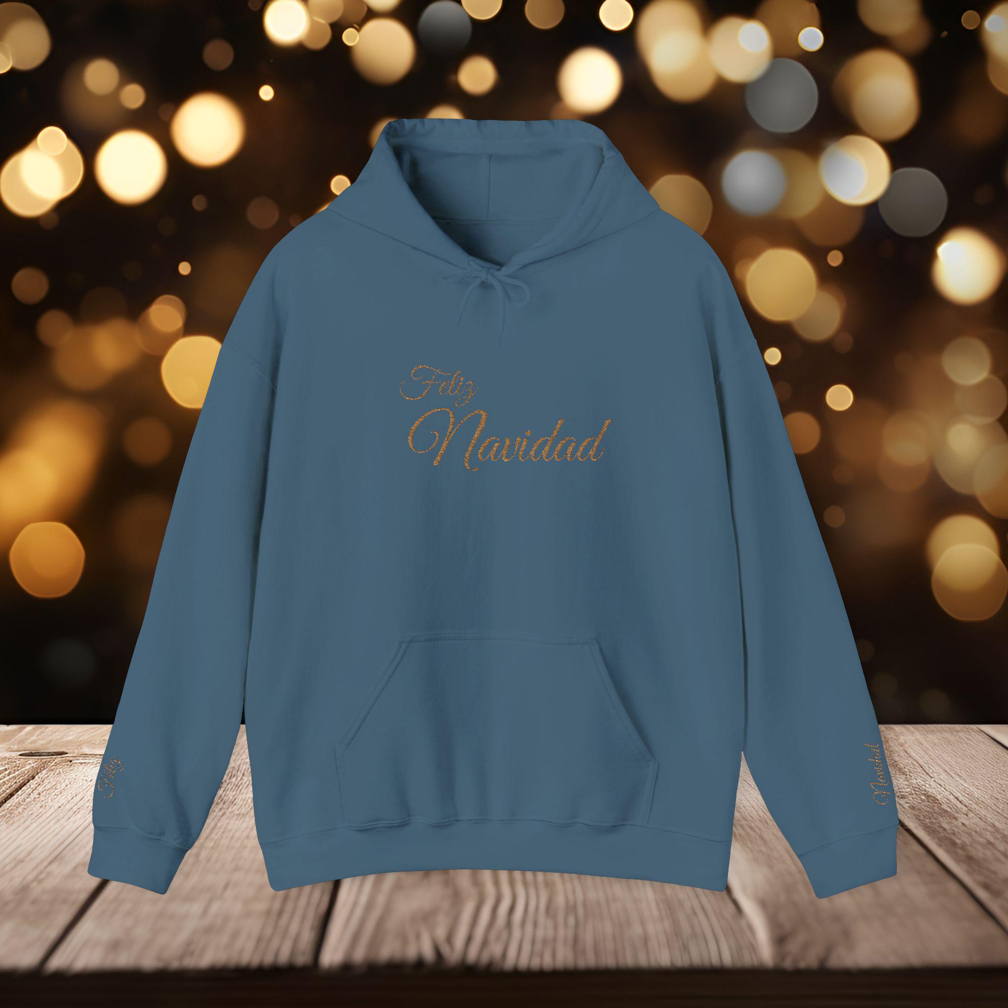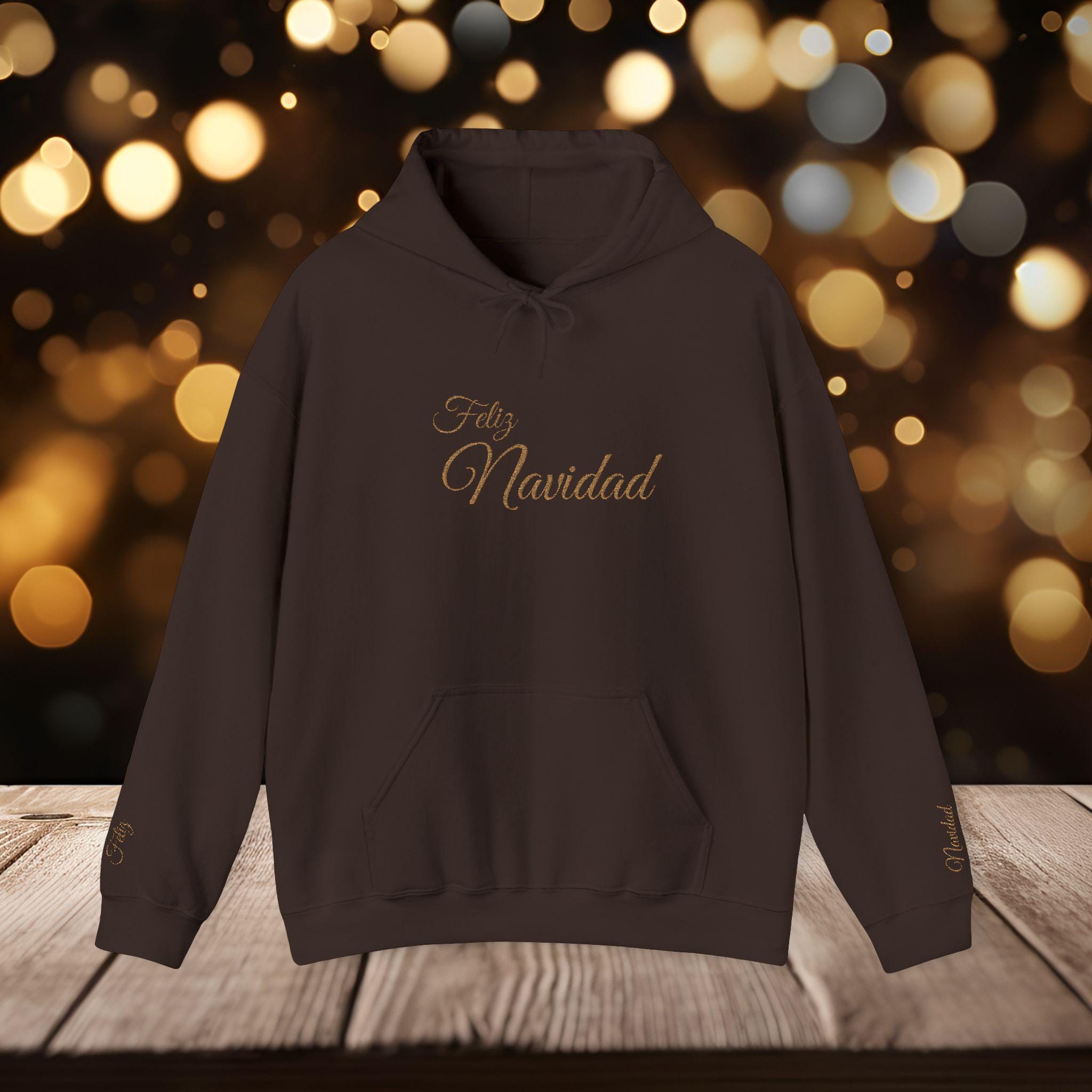 Soft, warm hoodie embroidered with delicate gold-script lettering that reads "Feliz Navidad." The clean white fabric and subtle sleeve details give it a quietly festive look — cozy enough for chilly holiday nights but refined for family dinners and winter outings. Slip it on after a day of decorating or wear it to evening caroling; the roomy kangaroo pocket and double-lined hood keep hands and head snug. Ethically produced and printed with gentle, low-impact dyes, this hoodie blends comfort, conscience, and a touch of seasonal sparkle.