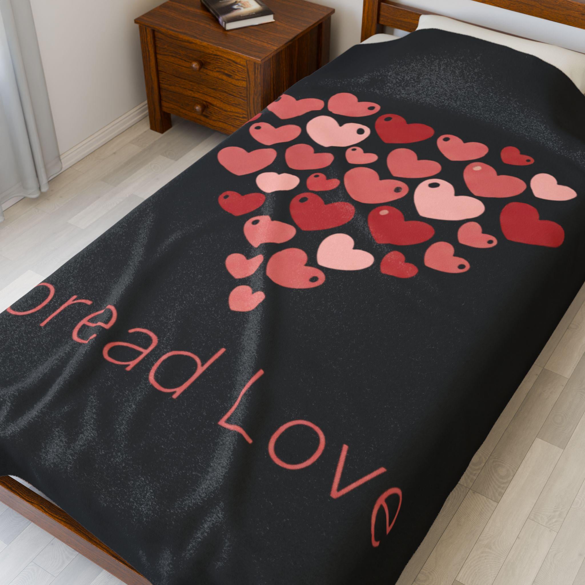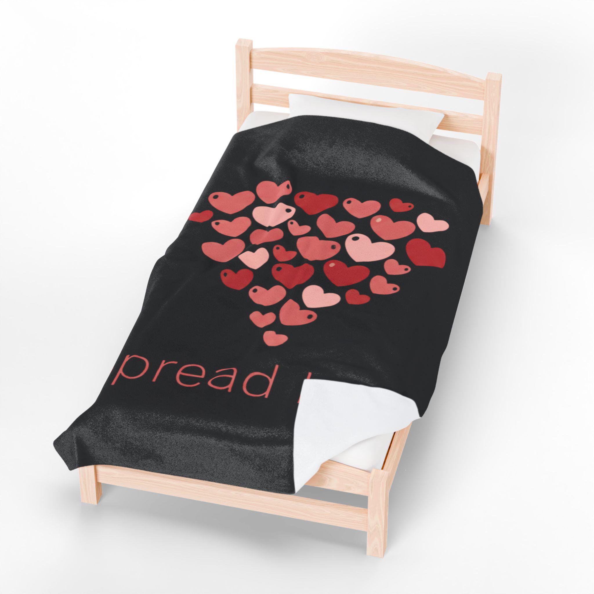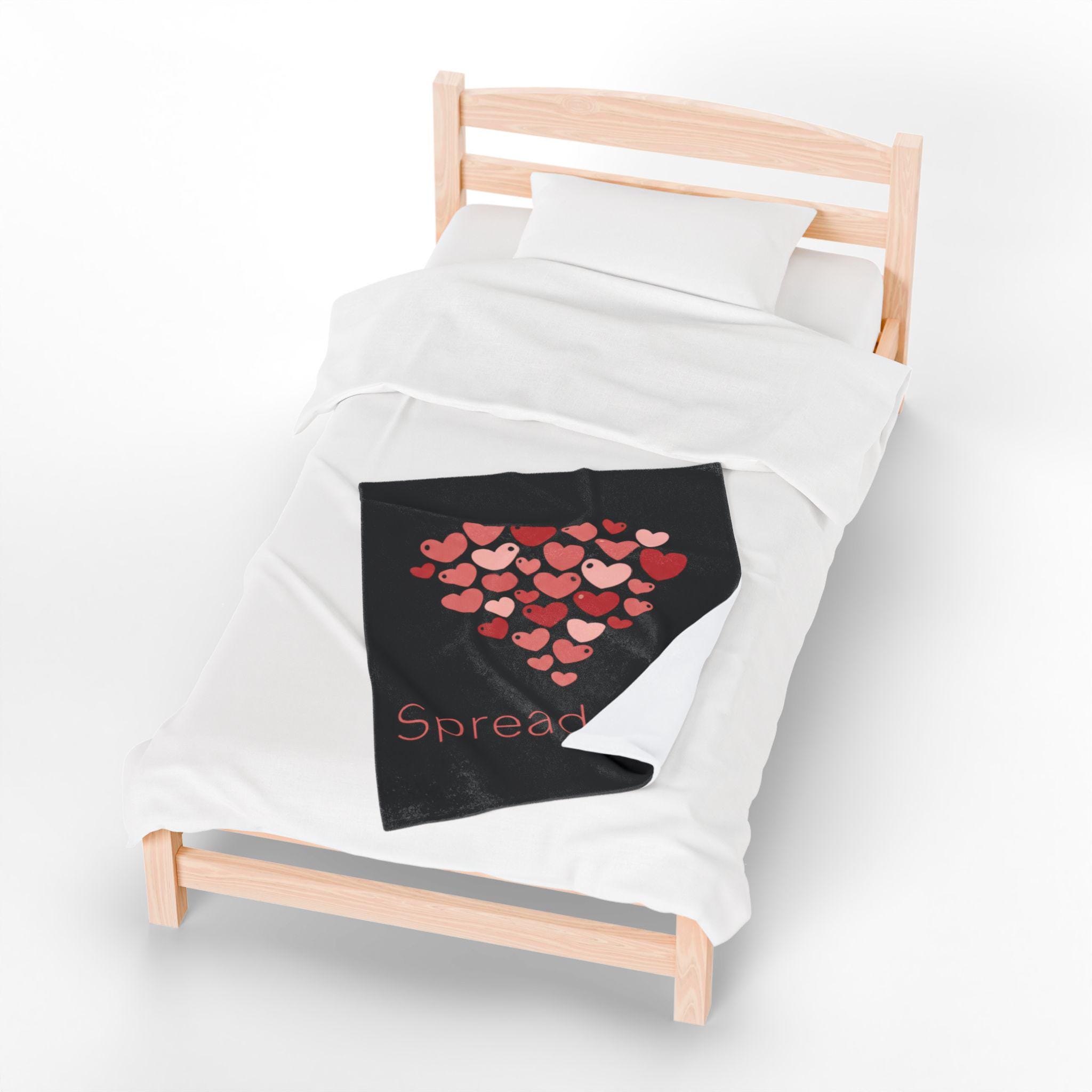 A soft, cozy velveteen blanket featuring a cluster of tiny heart motifs arranged into a gentle heart shape above a small, understated wordmark. The palette uses soft reds and pinks on a neutral white ground for a light, optimistic feel that reads as friendly and everyday — aligned with the Tiny Hearts Everywhere trend without heavy romance. Subtle, repeated hearts work as a wearable-at-home accent for layering on the sofa or adding a playful touch to a reading nook.
