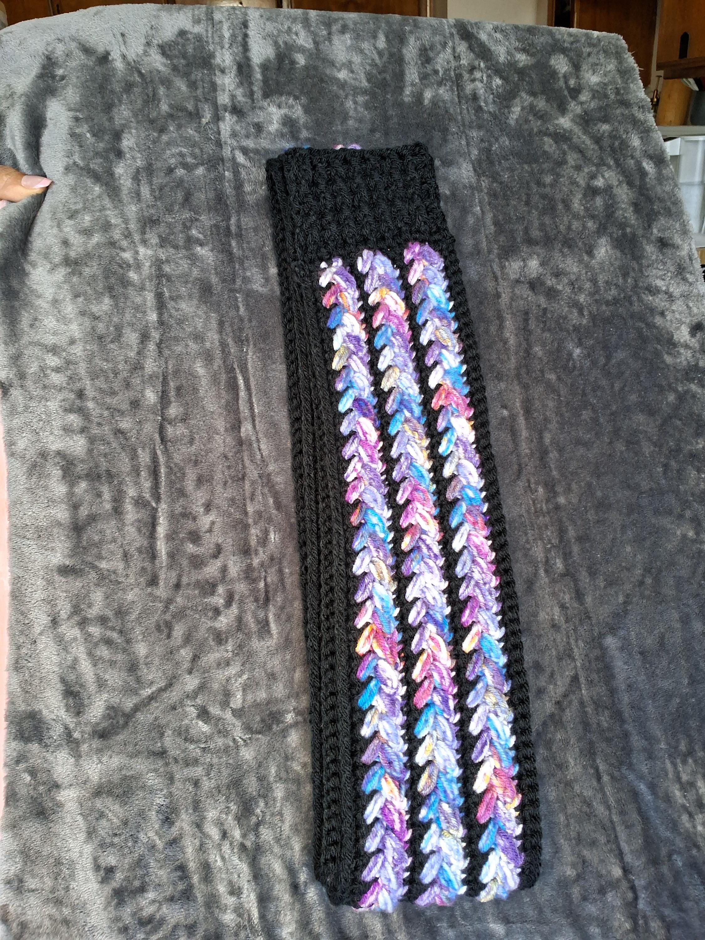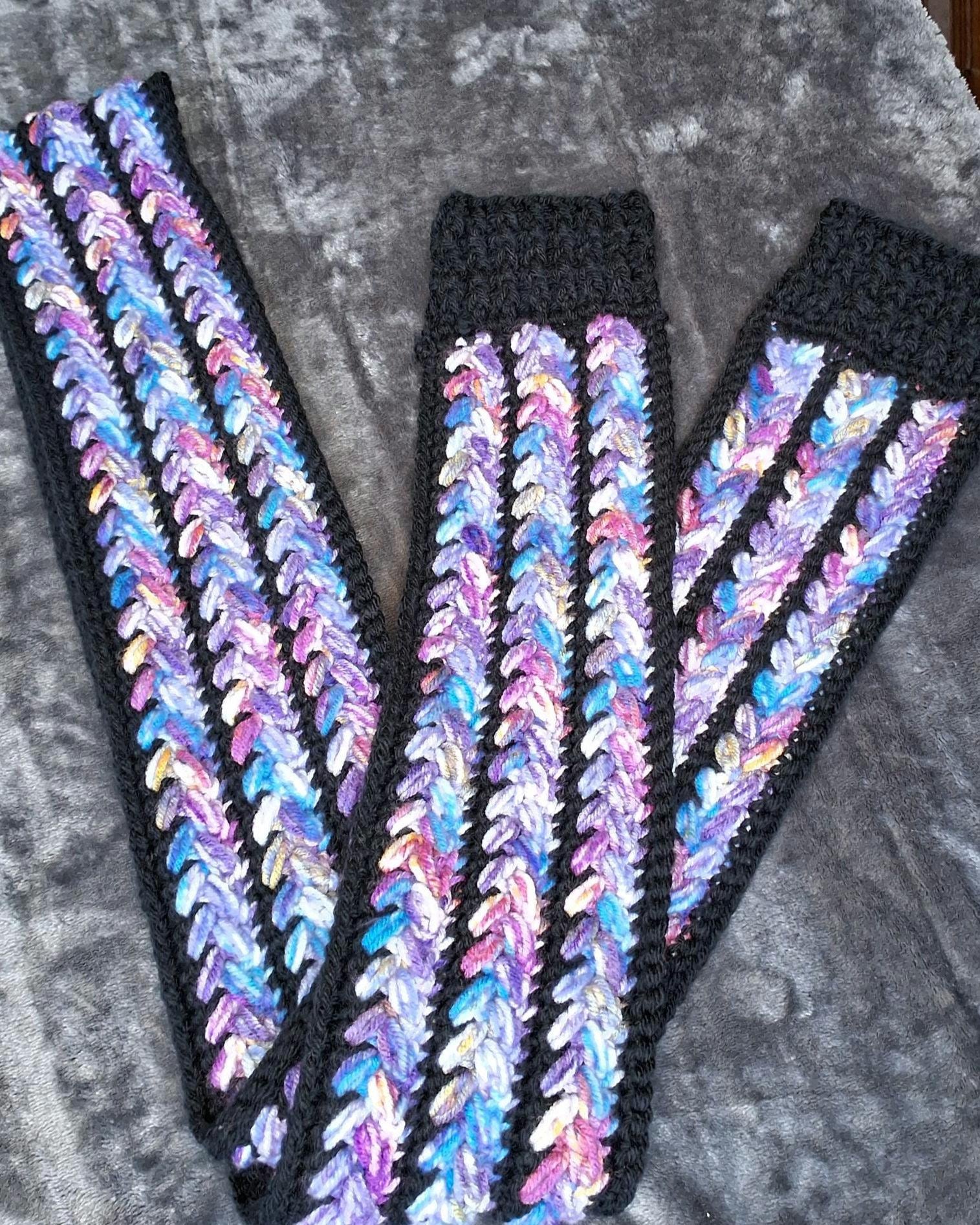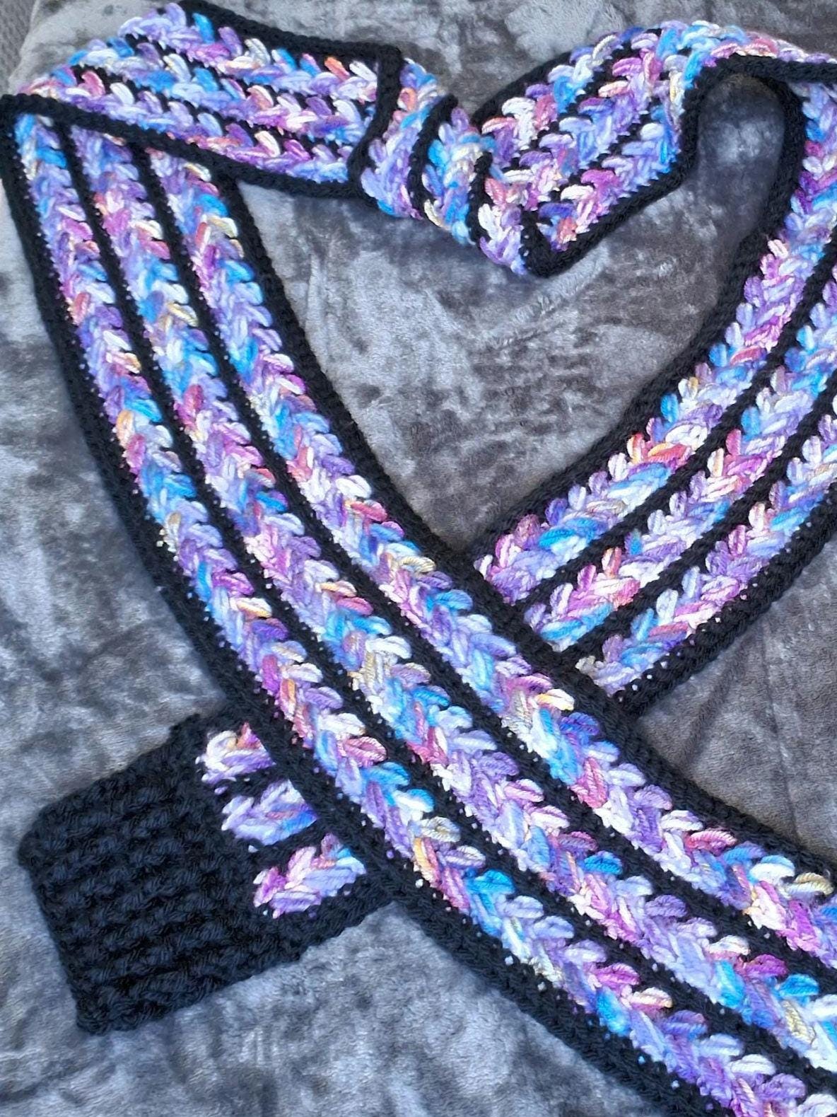 Long textured scarf. Soft acrylic yarn in purple galaxy-tone colorway.