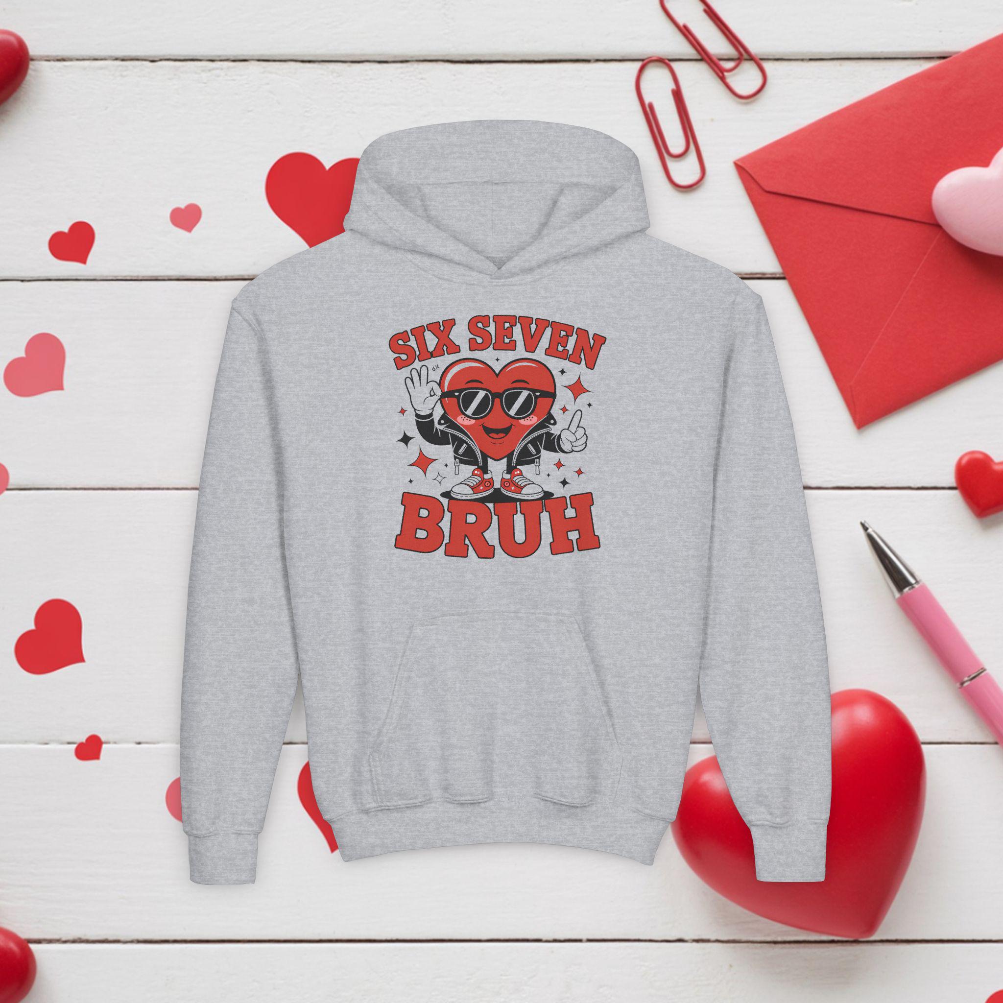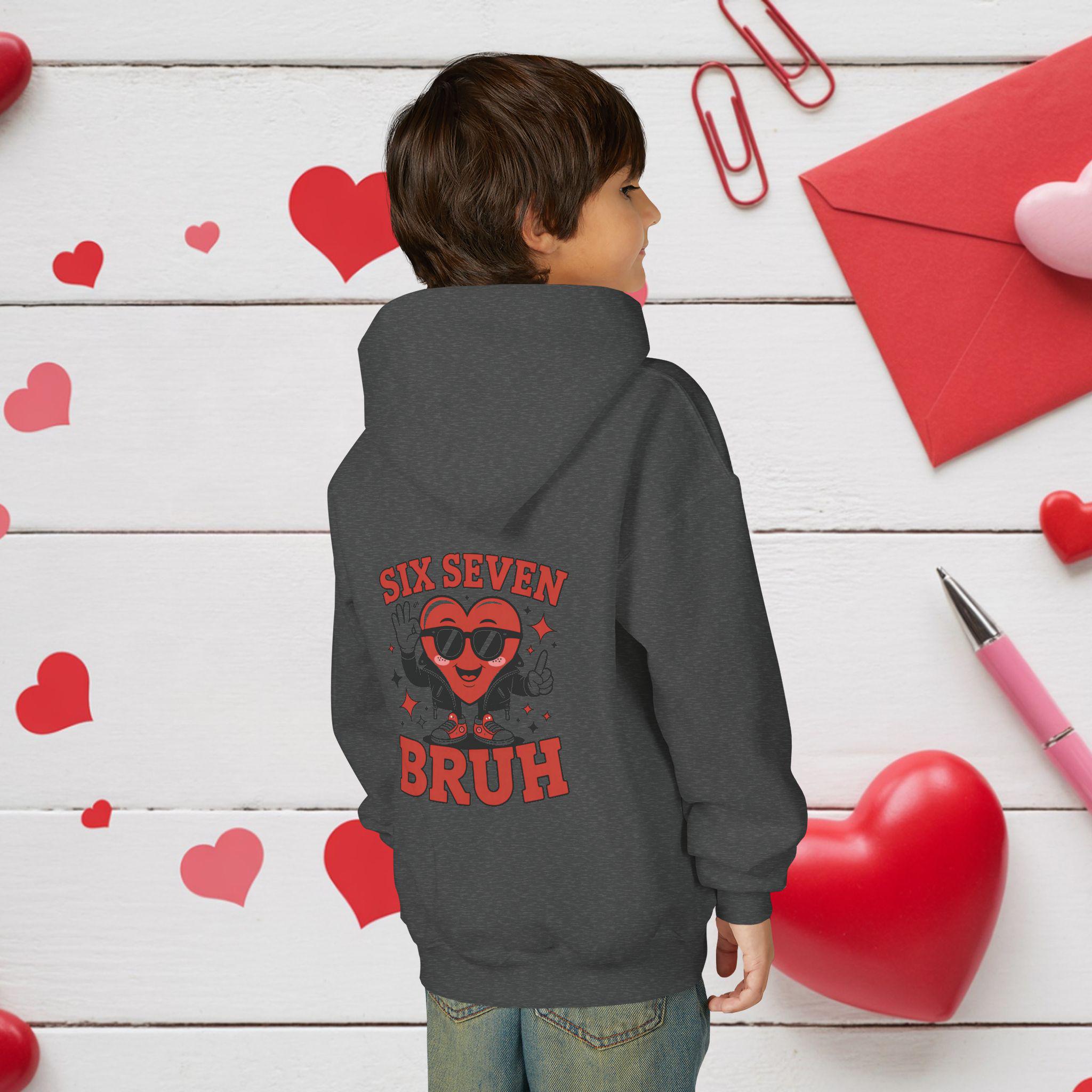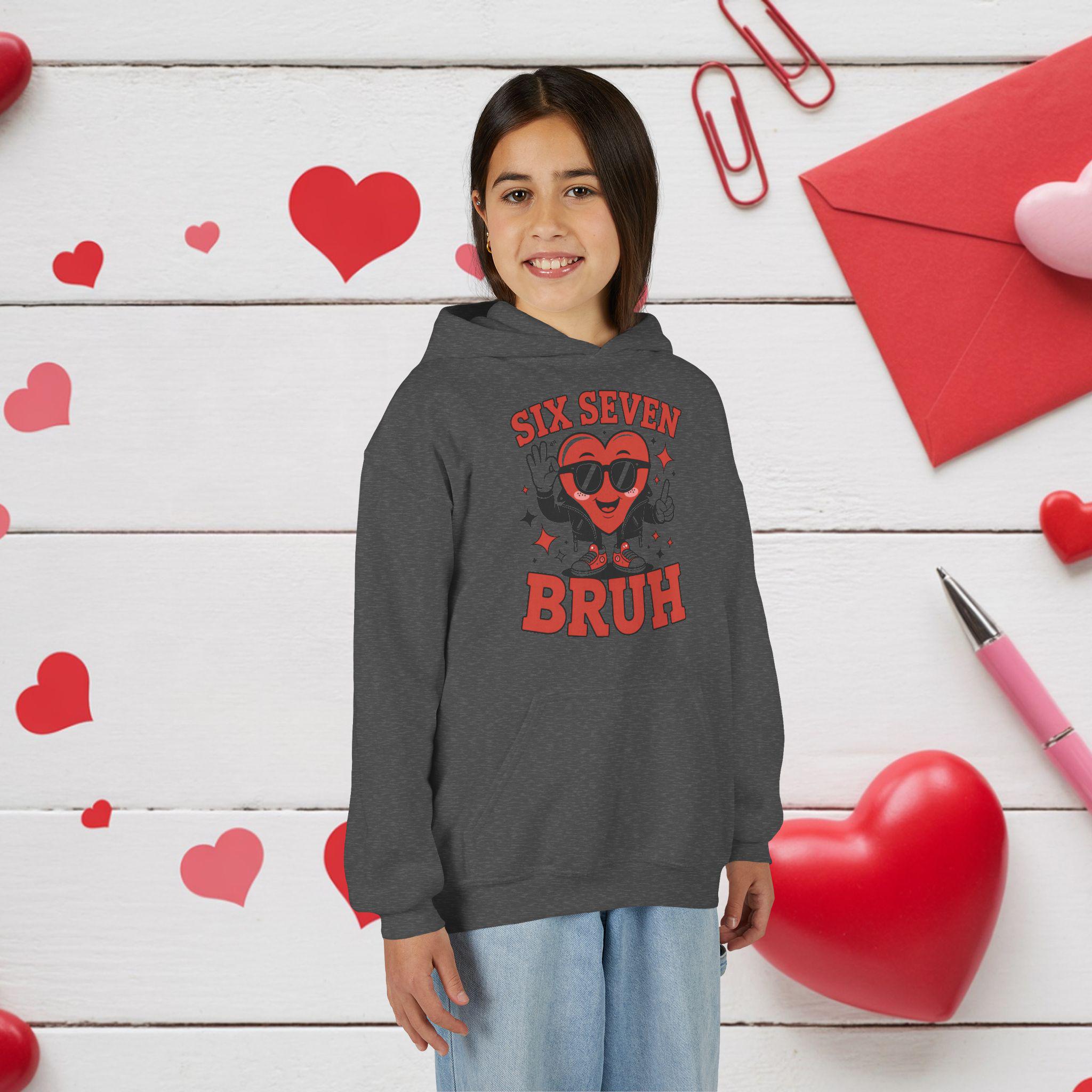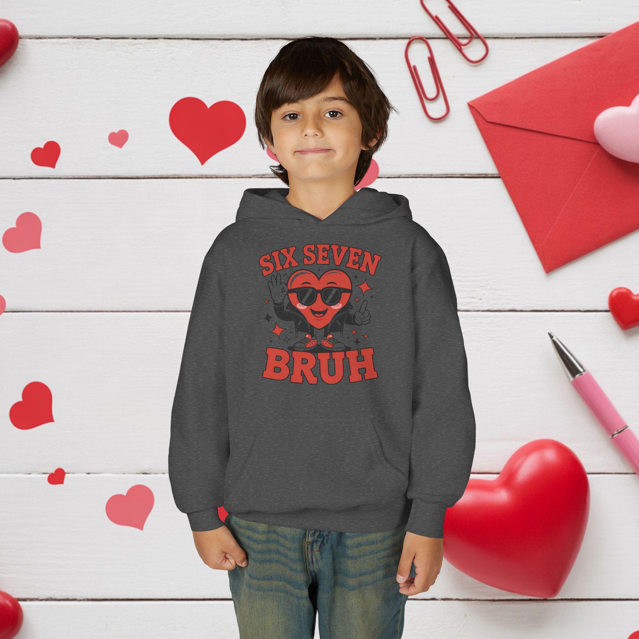 A cozy youth hoodie with a playful, retro graphic that brings attitude and warmth to everyday wear. The design centers on a smiling heart character wearing sunglasses with the bold text “SIX SEVEN BRUH,” giving a fun, slightly irreverent vibe that kids will love. The soft midweight fabric keeps it snug during school, after‑school hangouts, or weekend adventures. Thoughtful details—like a twill necktape for comfort, a roomy kangaroo pouch for hands or small treasures, and durable print and embroidery options—make this hoodie both durable and comfortable for active youngsters. Safety and compliance are built in, and the regular fit runs true to size so layering is simple.