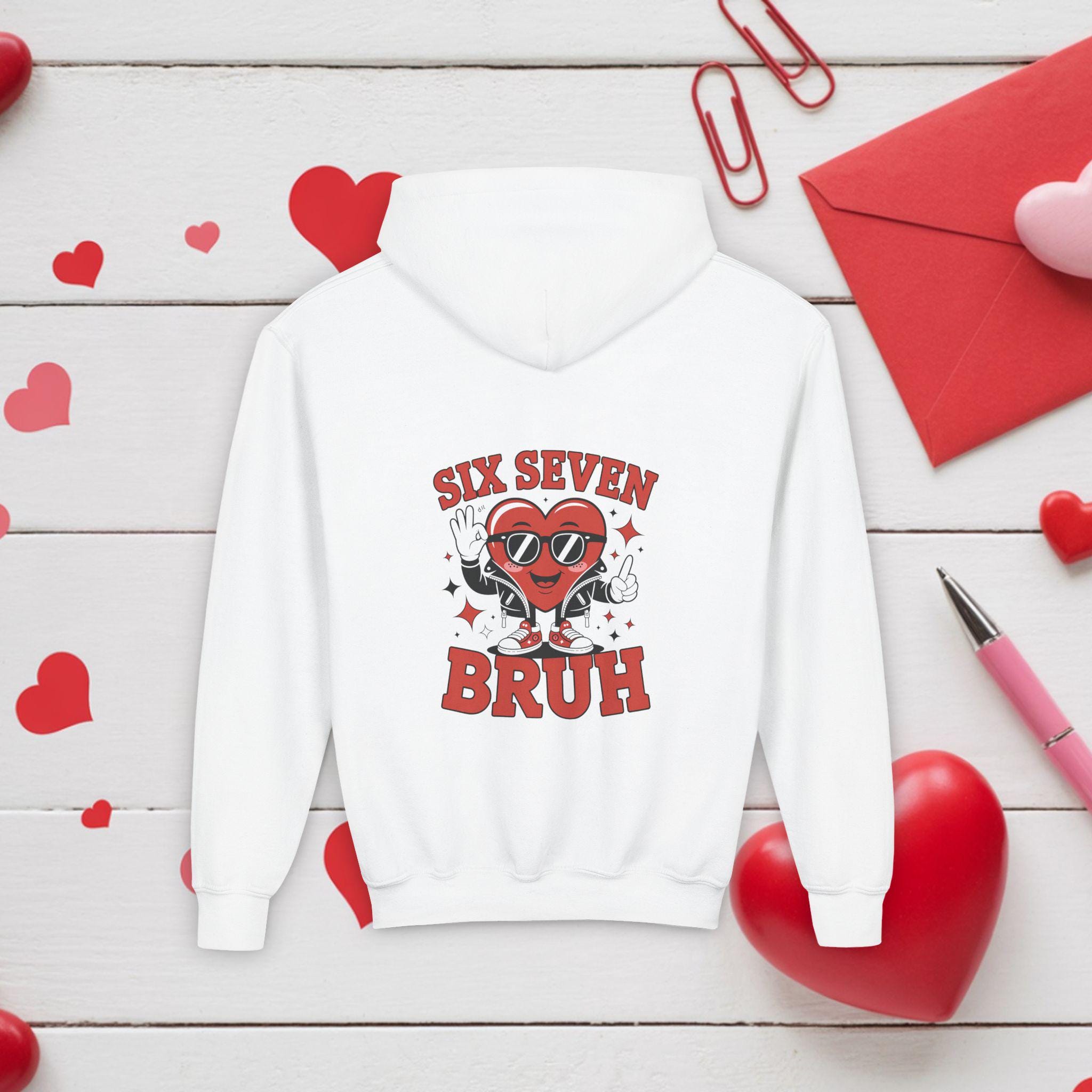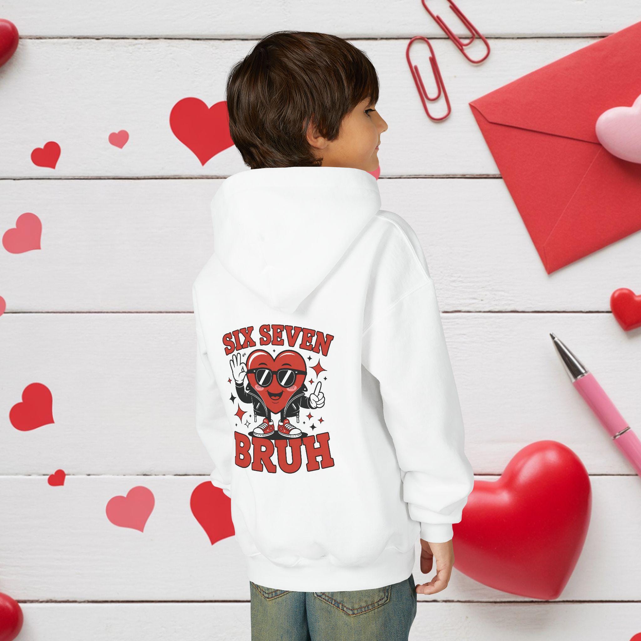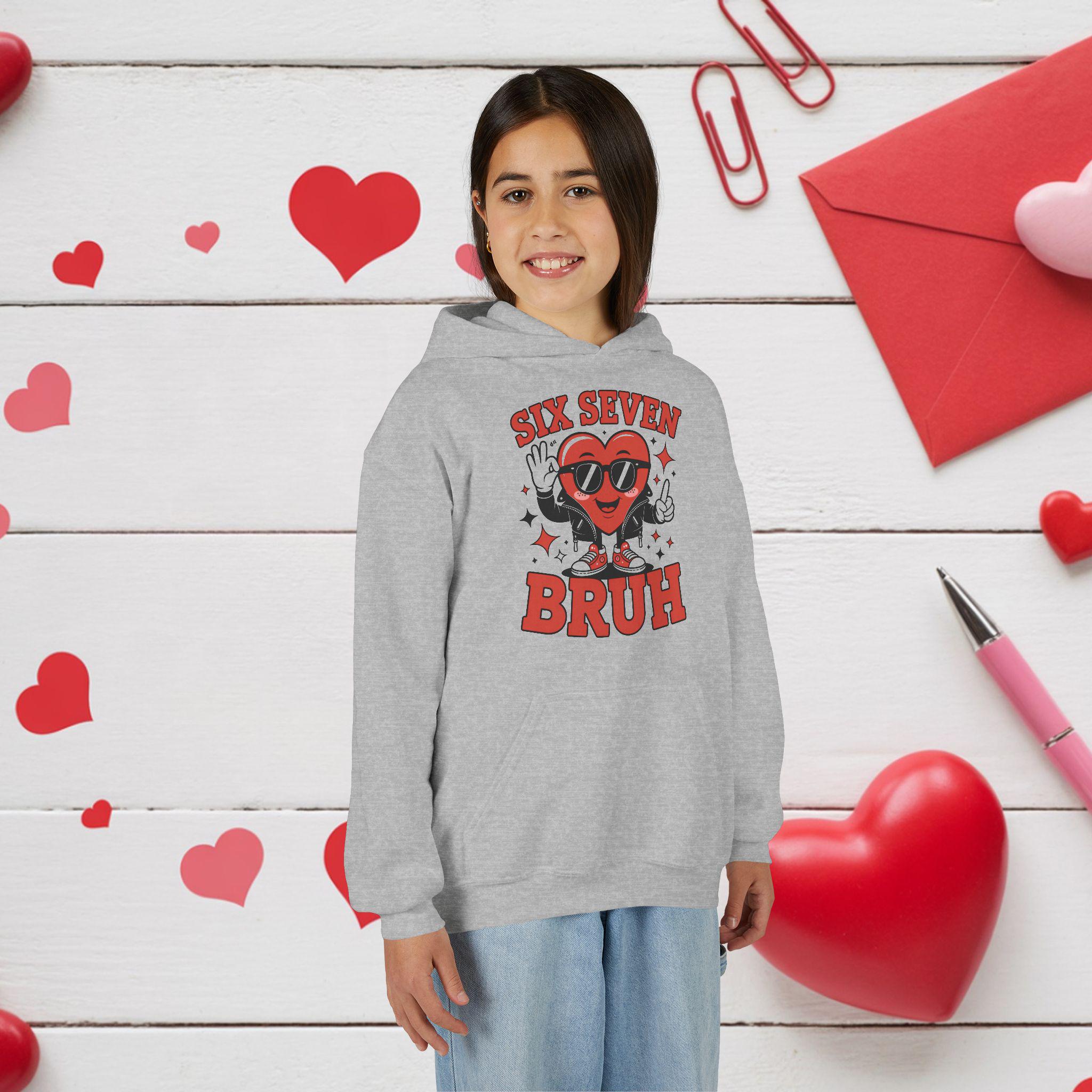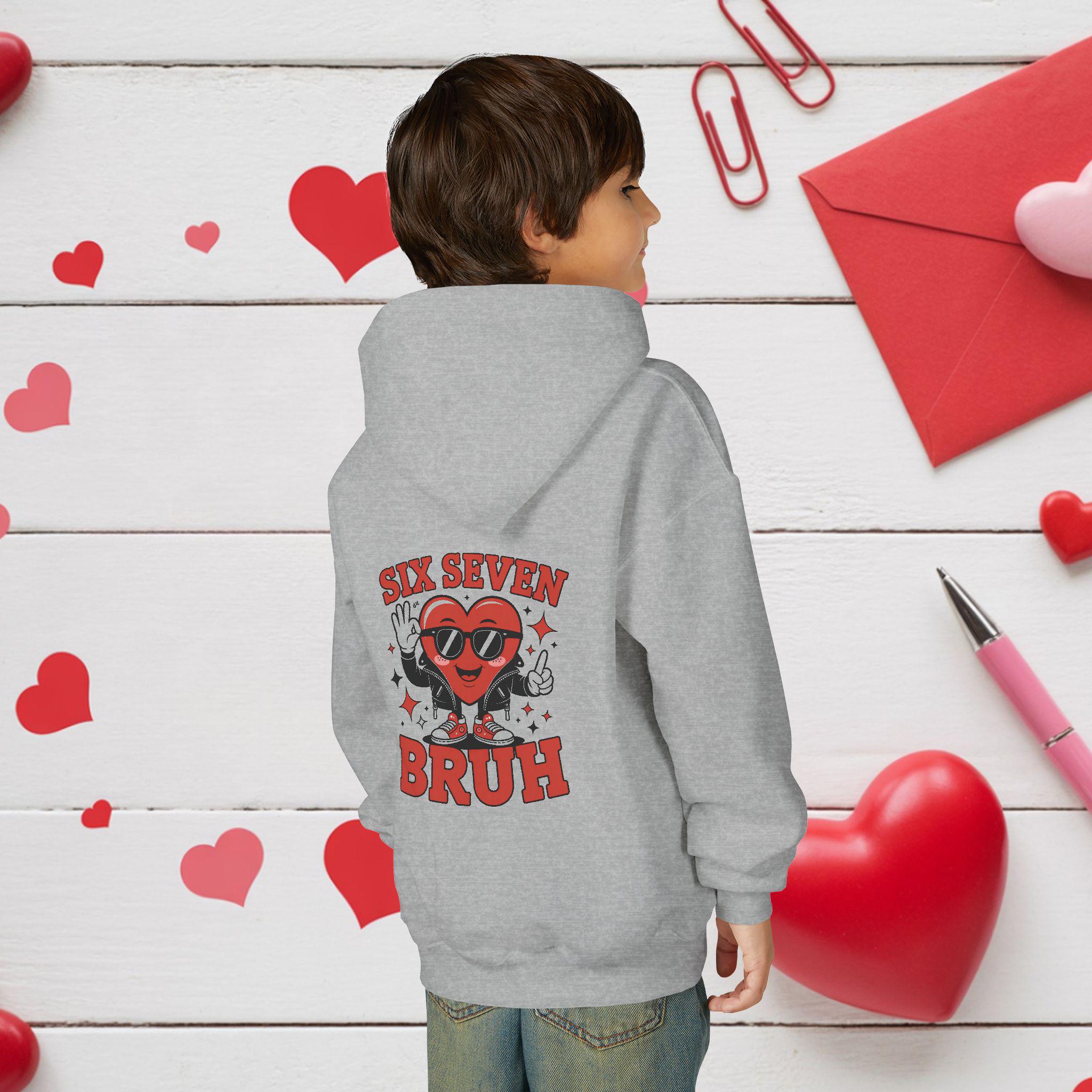 A cozy youth hoodie with a playful, retro graphic that brings attitude and warmth to everyday wear. The design centers on a smiling heart character wearing sunglasses with the bold text “SIX SEVEN BRUH,” giving a fun, slightly irreverent vibe that kids will love. The soft midweight fabric keeps it snug during school, after‑school hangouts, or weekend adventures. Thoughtful details—like a twill necktape for comfort, a roomy kangaroo pouch for hands or small treasures, and durable print and embroidery options—make this hoodie both durable and comfortable for active youngsters. Safety and compliance are built in, and the regular fit runs true to size so layering is simple.