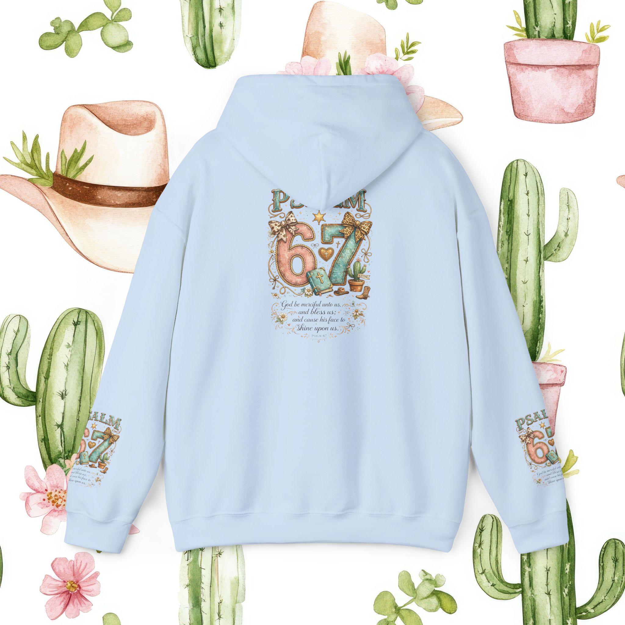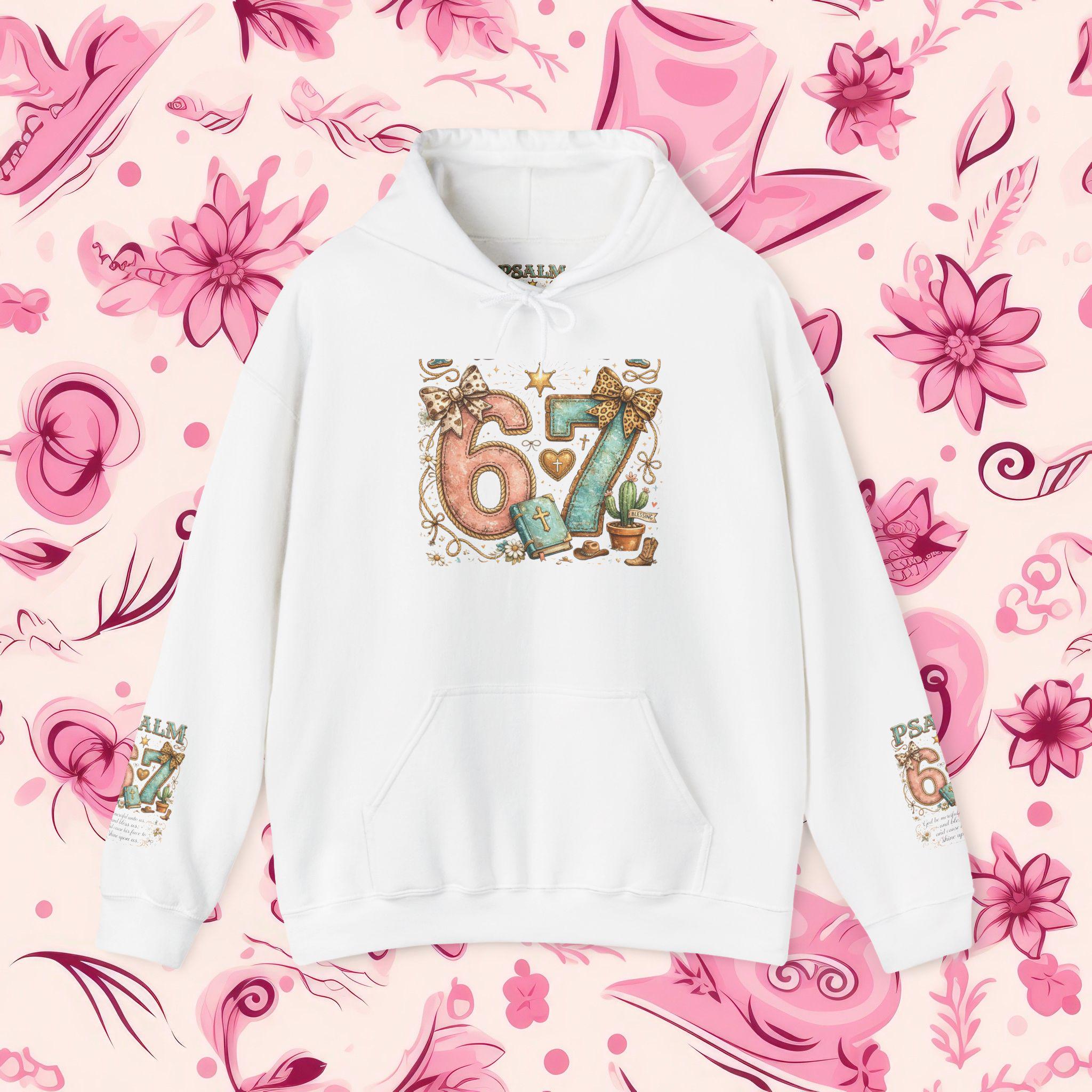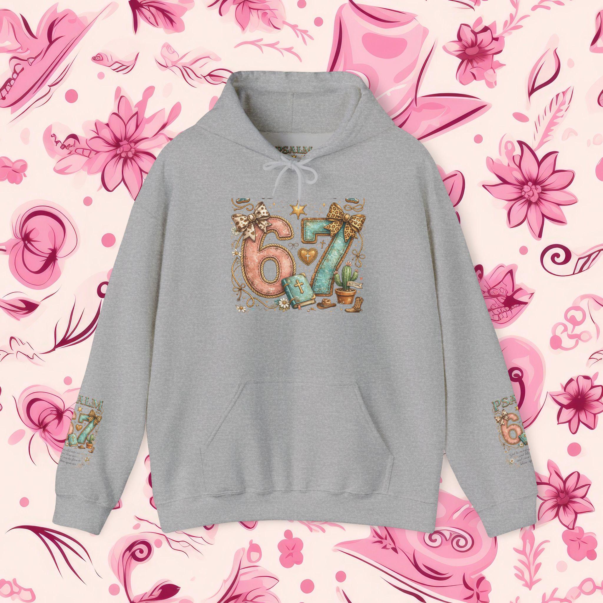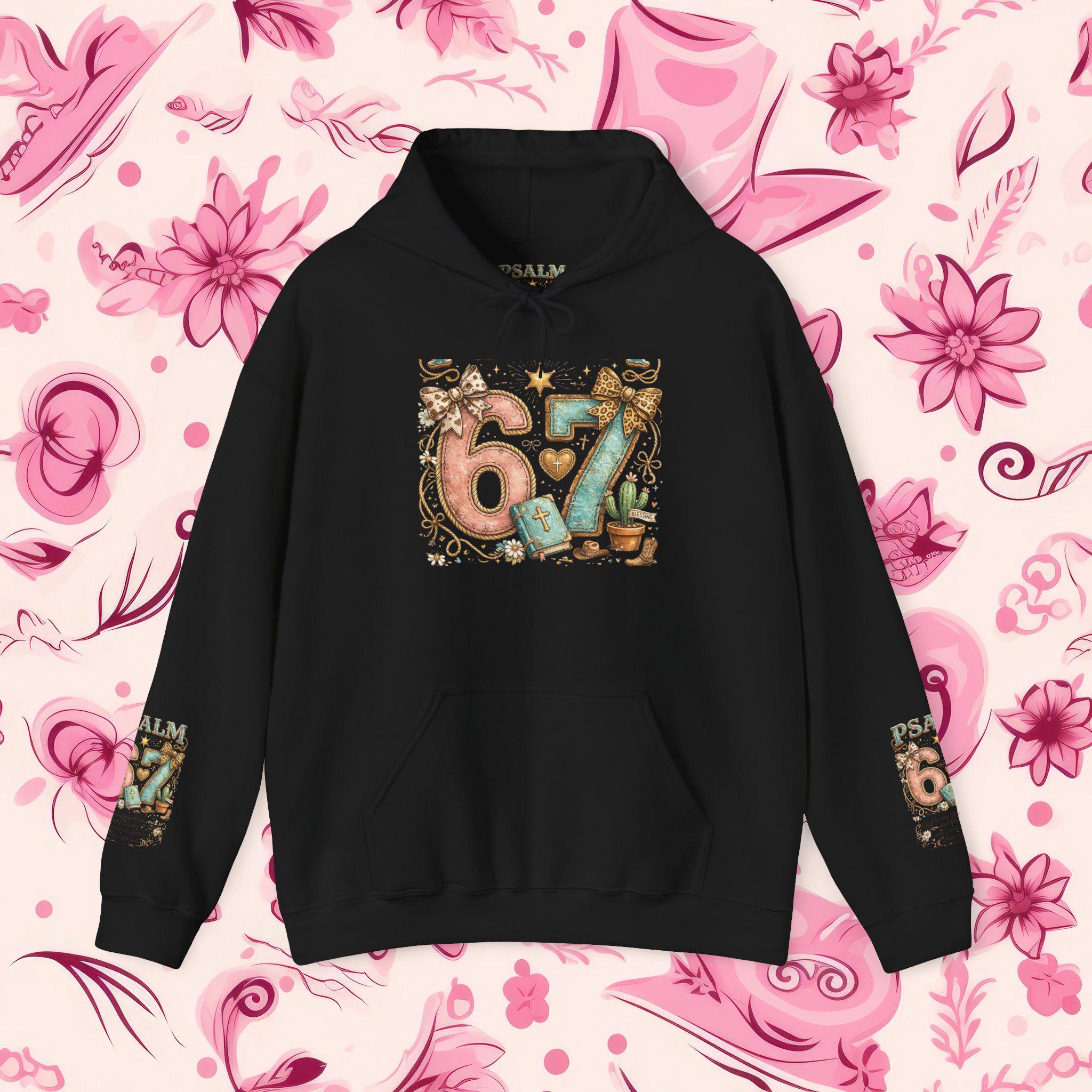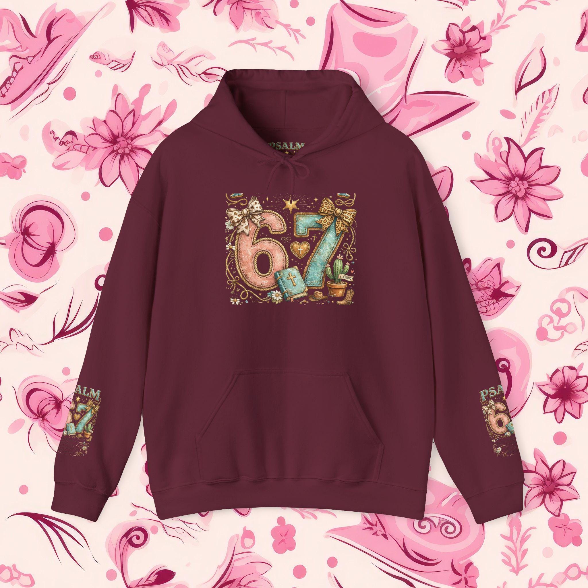 Stay wrapped in comfort and Scripture with this Psalm 67 Maroon Hoodie, designed for believers who love a touch of Western charm. The back features a bold, ornate “Psalm 67” graphic surrounded by floral scrolls and rustic accents, while the sleeves carry matching mini motifs for a full-bodied statement of faith. Whether you're headed to Bible study, a country concert, or a cozy day in, this hoodie speaks grace with every wear.