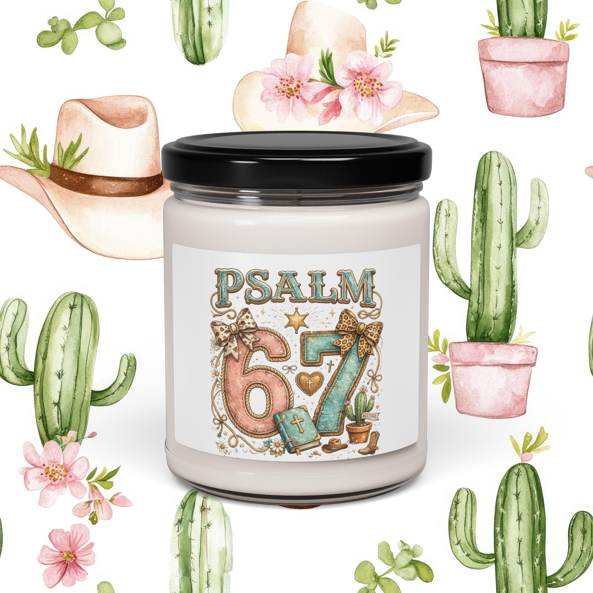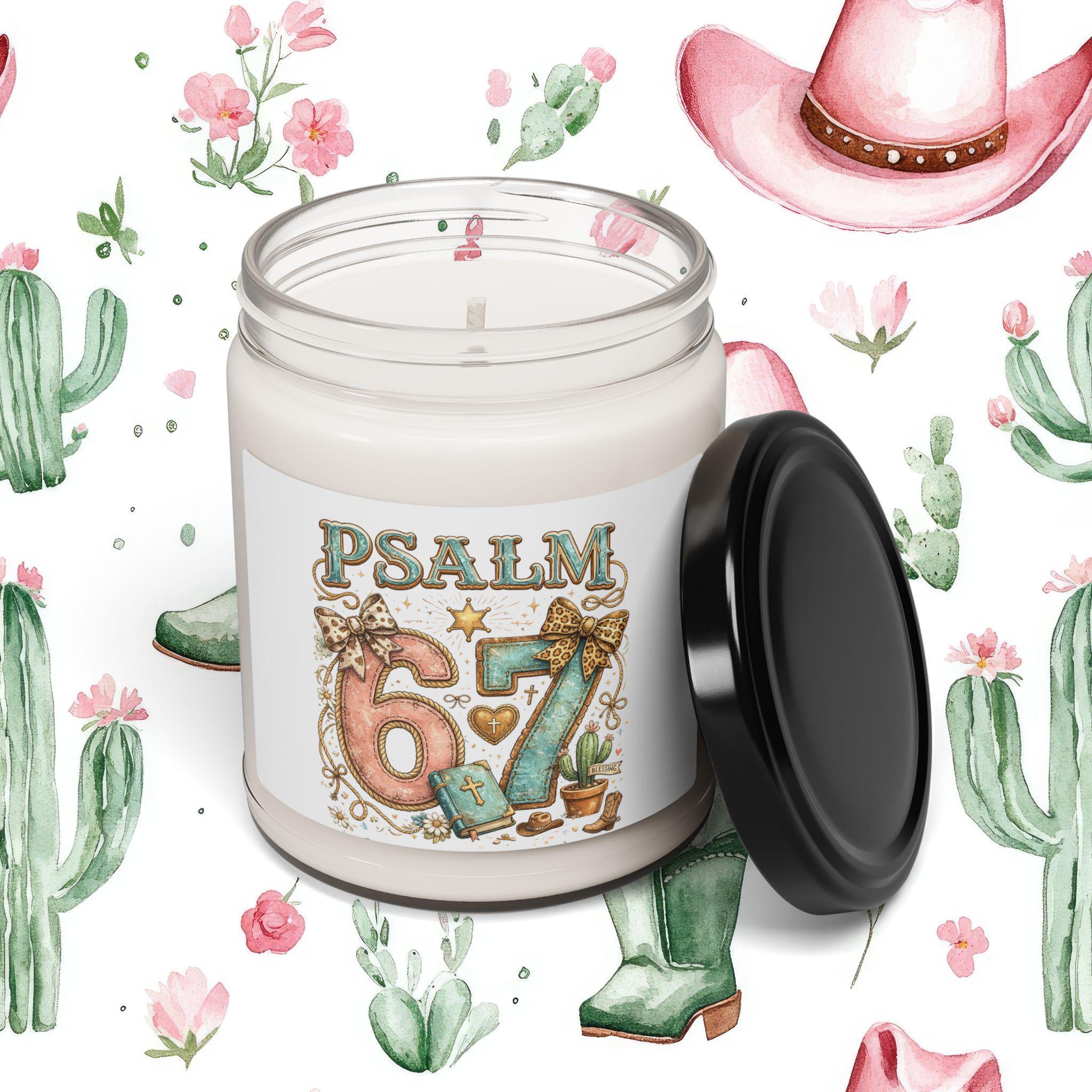 Light up your space with grace and Western charm. This Psalm 67 decorative candle features a vibrant, ornate label with bows, stars, a heart, Bible, cross, cactus, cowboy boots, and hat—all wrapped around the powerful Scripture: “God be merciful unto us, and bless us; and cause His face to shine upon us.” It’s a sweet reminder of divine mercy and country soul, perfect for prayer time, cozy evenings, or gifting to someone who walks by faith.